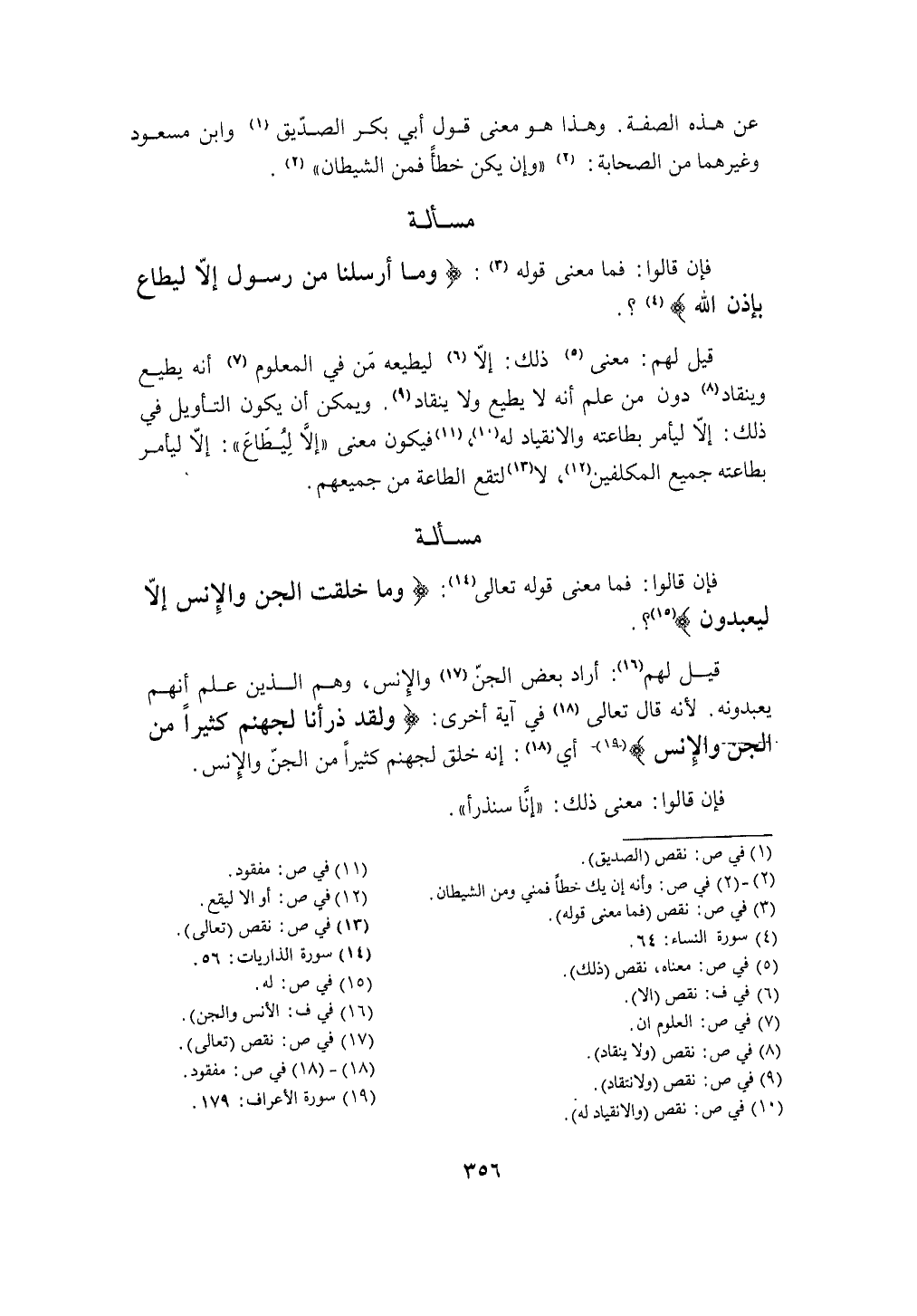 عَن هَذِه الصّفة وَهَذَا هُوَ معنى قَول أبي بكر الصّديق وَابْن مَسْعُود وَغَيرهمَا من الصَّحَابَة وَإِن يكن خطأ فَمن الشَّيْطَان
