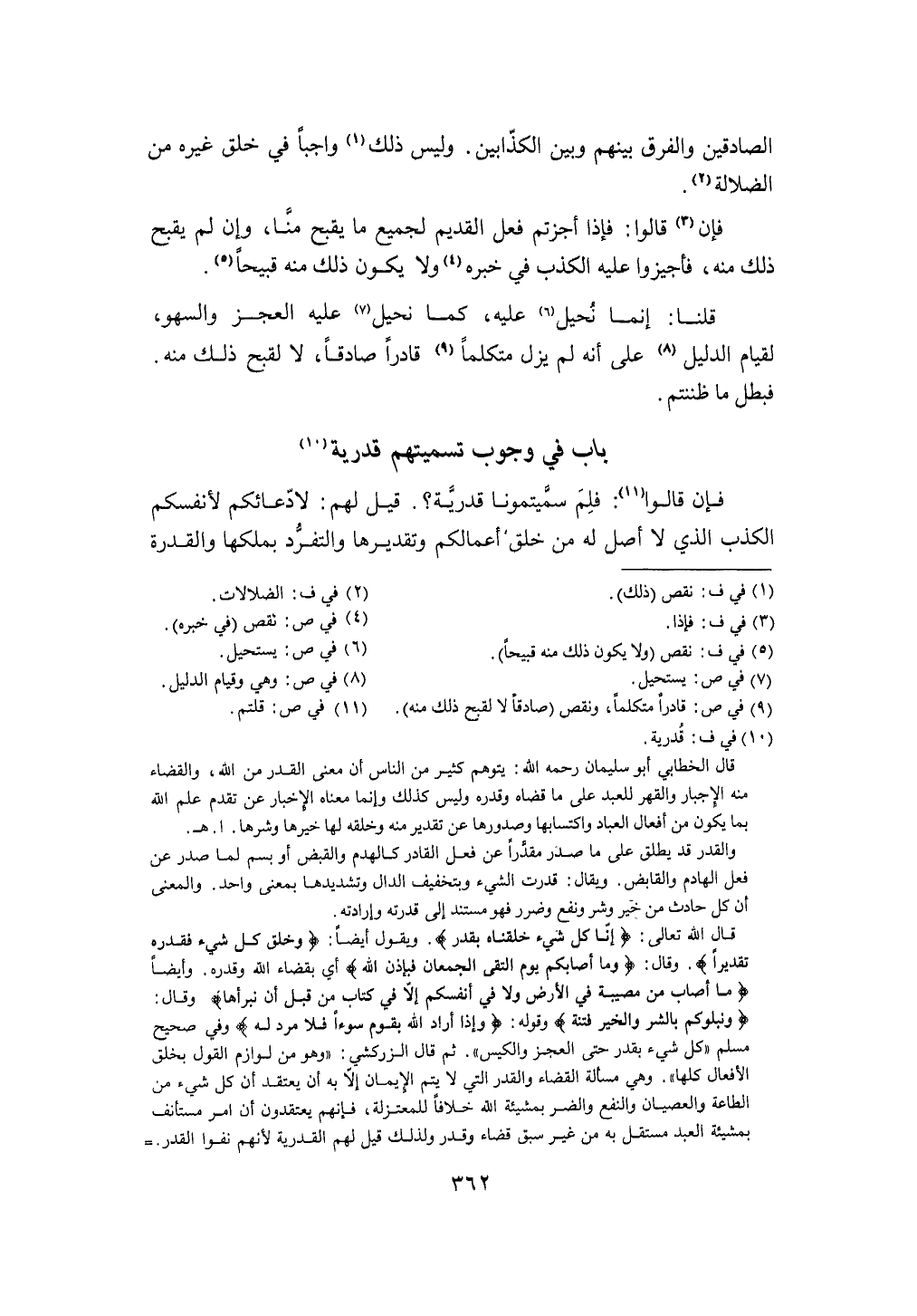 قُلْنَا إِنَّمَا نحيل عَلَيْهِ كَمَا نحيل عَلَيْهِ الْعَجز والسهو لقِيَام الدَّلِيل على أَنه لم يزل متكلما قَادِرًا صَادِقا لَا لقبح ذَلِك مِنْهُ