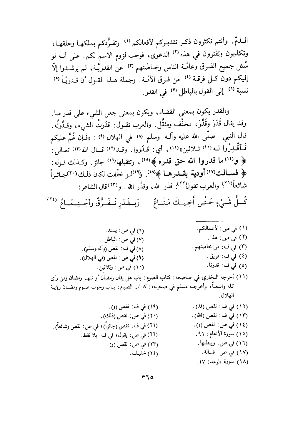 على أَنه لَو سُئِلَ جَمِيع الْفرق وَعَامة النَّاس وخاصتهم عَن الْقَدَرِيَّة لم يرشدوا إِلَّا إِلَيْكُم دون كل فرقة من فرق الْأمة