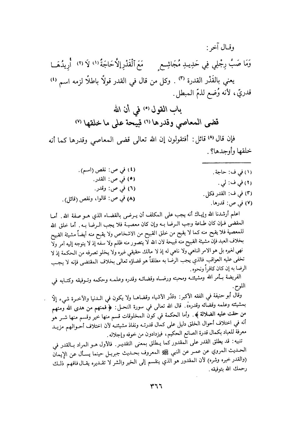 بَاب القَوْل فِي أَن الله قضى الْمعاصِي وقدرها قبيحة على مَا خلقهَا