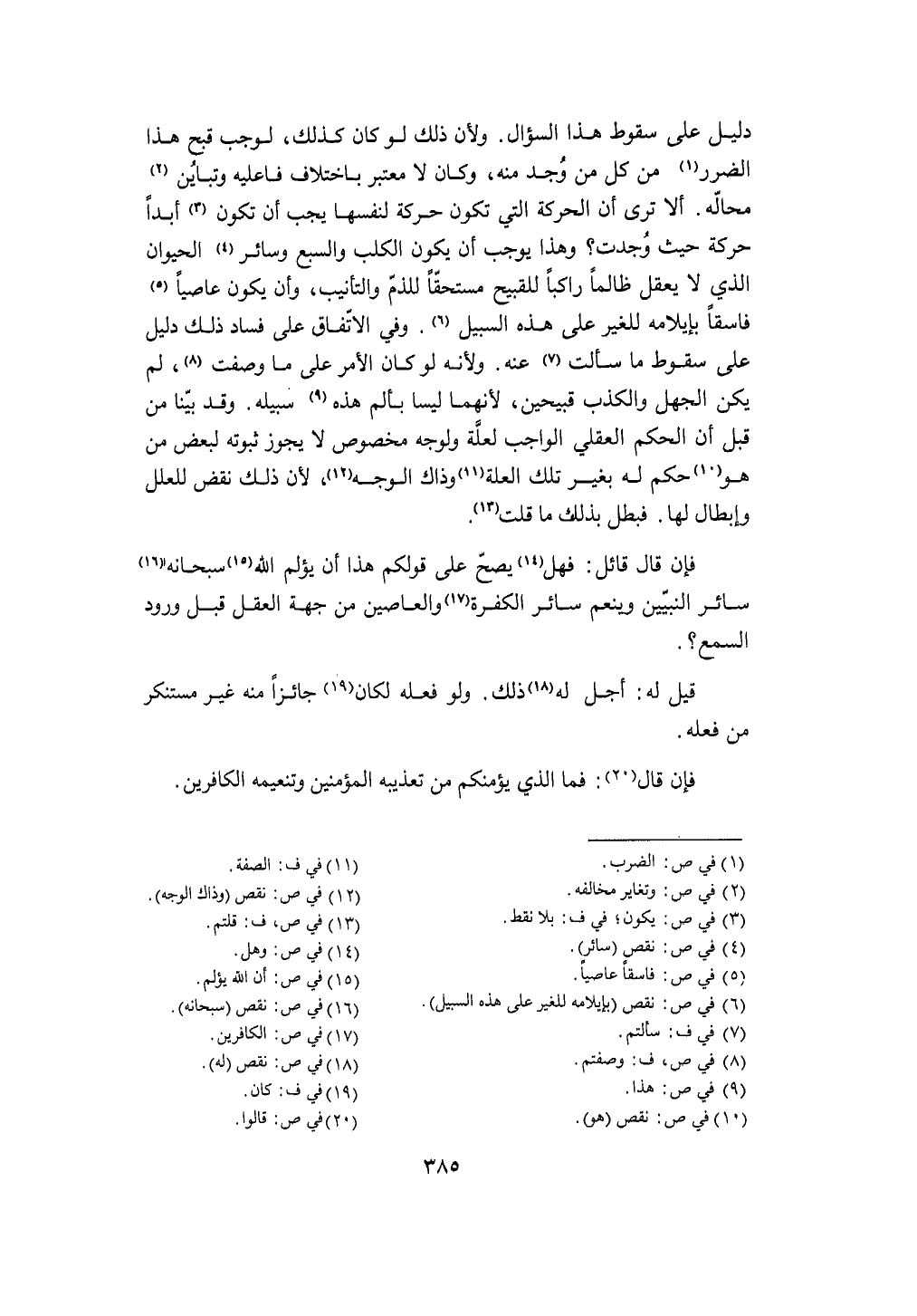 أَلا ترى أَن الْحَرَكَة الَّتِي تكون حَرَكَة لنَفسهَا يجب أَن تكون أبدا حَرَكَة حَيْثُ وجدت وَهَذَا يُوجب أَن يكون الْكَلْب والسبع وَسَائِر الْحَيَوَان الَّذِي لَا يعقل ظَالِما رَاكِبًا للقبيح مُسْتَحقّا للذم والتأنيب وَأَن يكون عَاصِيا فَاسِقًا بإيلامه للْغَيْر على هَذِه السَّبِيل