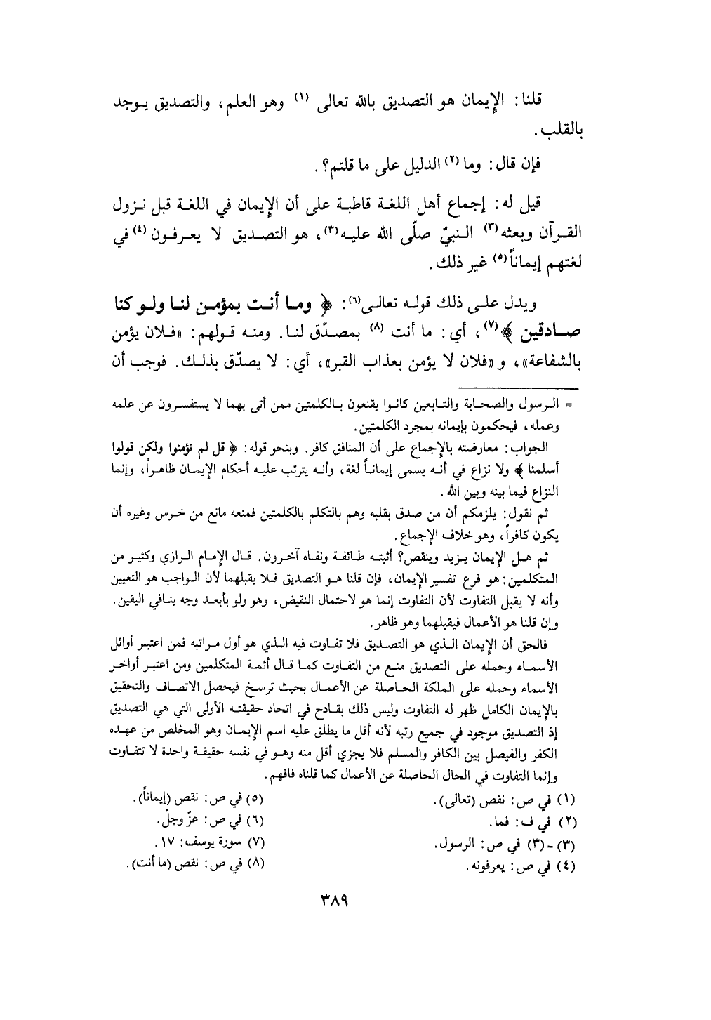 وَيدل على ذَلِك قَوْله تَعَالَى {وَمَا أَنْت بِمُؤْمِن لنا وَلَو كُنَّا صَادِقين} أَي مَا أَنْت بمصدق لنا
