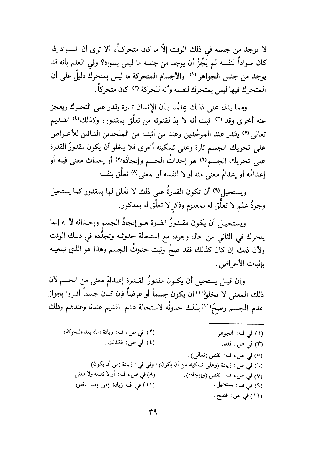 وَمِمَّا يدل على ذَلِك علمنَا بِأَن الْإِنْسَان تَارَة يقدر على التحرك ويعجز عَنهُ أُخْرَى وَقد ثَبت أَنه لَا بُد لقدرته من تعلق بمقدور وَكَذَلِكَ الْقَدِيم تَعَالَى يقدر عِنْد الْمُوَحِّدين وَعند من أثْبته من الْمُلْحِدِينَ النافين للأعراض على تَحْرِيك الْجِسْم تَارَة وعَلى تسكينه أُخْرَى فَلَا يَخْلُو أَن يكون مَقْدُور الْقُدْرَة على تَحْرِيك الْجِسْم هُوَ إِحْدَاث الْجِسْم وإيجاده أَو إِحْدَاث معنى فِيهِ أَو إعدامه أَو إعدام معنى مِنْهُ أَو لَا لنَفسِهِ أَو لِمَعْنى تعلق بِنَفسِهِ