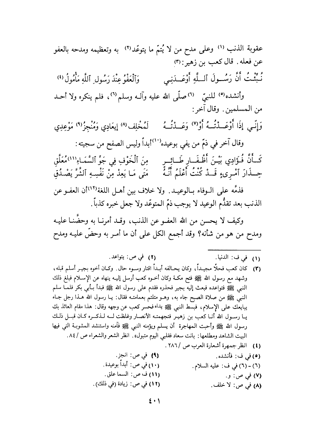 (نبئت أَن رَسُول الله أوعدني ... وَالْعَفو عِنْد رَسُول الله مأمول) وأنشده للنَّبِي صلى الله عَلَيْهِ وَسلم فَلم يُنكره وَلَا أحد من الْمُسلمين