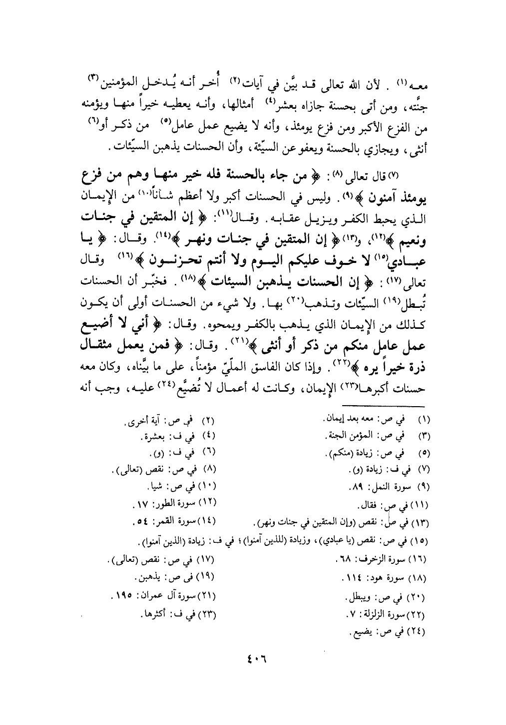 وَإِذا كَانَ الْفَاسِق الملي مُؤمنا على مَا بَيناهُ وَكَانَ مَعَه حَسَنَات أكبرها الْإِيمَان وَكَانَت لَهُ أَعمال لَا تضيع عَلَيْهِ وَجب أَنه
