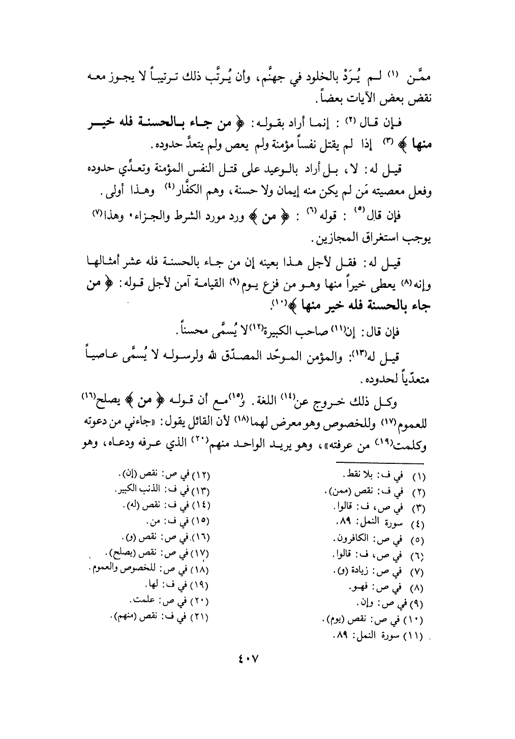 قيل لَهُ لَا بل أَرَادَ بالوعيد على قتل النَّفس المؤمنة وتعدي حُدُوده وَفعل مَعْصِيَته من لم يكن مِنْهُ إِيمَان وَلَا حَسَنَة وهم الْكفَّار وَهَذَا أولى