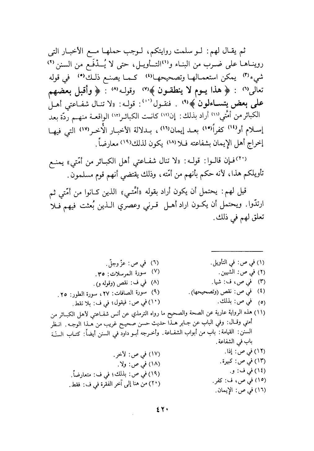فَإِن قَالُوا قَوْله لَا تنَال شَفَاعَتِي أهل الْكَبَائِر من أمتِي يمْنَع تأويلكم هَذَا لِأَنَّهُ حكم بِأَنَّهُم من أمته وَذَلِكَ يَقْتَضِي أَنهم قوم مُسلمُونَ