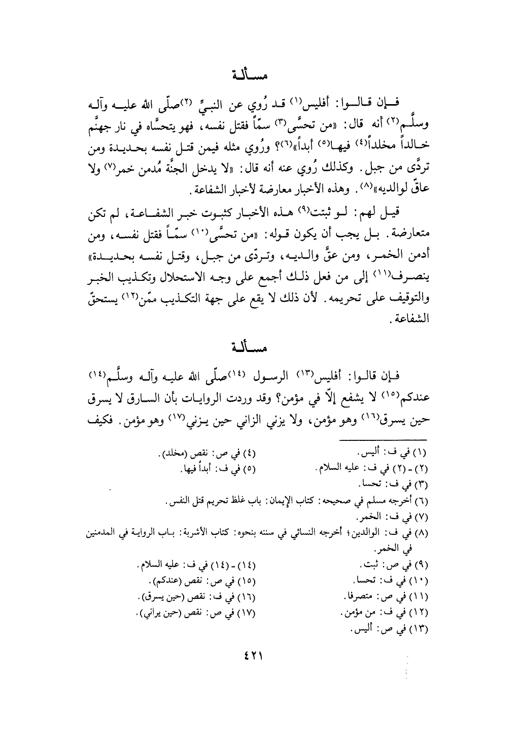 فَإِن قَالُوا أفليس قد رُوِيَ عَن النَّبِي صلى الله عَلَيْهِ وَسلم وَآله أَنه قَالَ (من تحسى سما فَقتل نَفسه فَهُوَ يتحساه فِي نَار جَهَنَّم خَالِدا مخلدا فِيهَا أبدا) وَرُوِيَ مثله فِيمَن قتل نَفسه بحديدة وَمن تردى من جبل