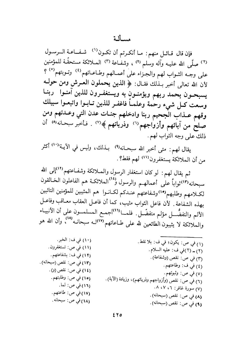 فَإِن قَالَ قَائِل مِنْهُم مَا أنكرتم أَن تكون شَفَاعَة الرَّسُول صلى الله عَلَيْهِ وَسلم وشفاعة الْمَلَائِكَة مُسْتَحقَّة للْمُؤْمِنين على وَجه الثَّوَاب لَهُم وَالْجَزَاء على أَعْمَالهم وطاعاتهم وتوبتهم لِأَن الله تَعَالَى أخبر بذلك فَقَالَ الَّذين يحملون الْعَرْش وَمن حوله يسبحون بِحَمْد رَبهم ويؤمنون بِهِ وَيَسْتَغْفِرُونَ للَّذين آمنُوا رَبنَا وسعت كل شَيْء رَحْمَة وعلما فَاغْفِر للَّذين تَابُوا وَاتبعُوا سَبِيلك وقهم عَذَاب الْجَحِيم رَبنَا وادخلهم جنَّات عدن الَّتِي وعدتهم وَمن صلح من آبَائِهِم وأزواجهم وذرياتهم