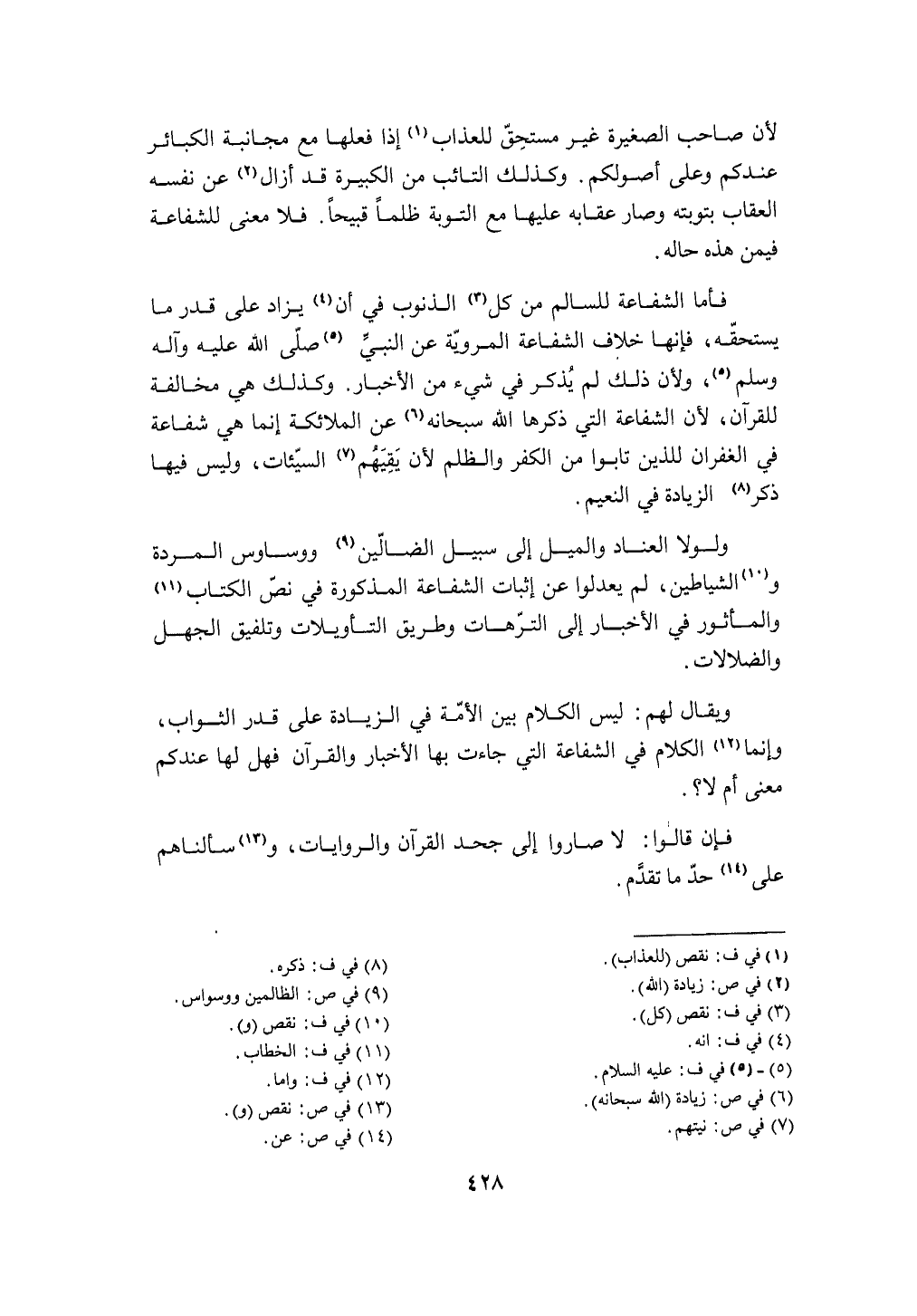 وَلَوْلَا العناد والميل إِلَى سَبِيل الضَّالّين ووساوس المردة وَالشَّيَاطِين لم يعدلُوا عَن إِثْبَات الشَّفَاعَة الْمَذْكُورَة فِي نَص الْكتاب والمأثورة فِي الْأَخْبَار إِلَى الترهات وَطَرِيق التأويلات وتلفيق الْجَهْل والضلالات