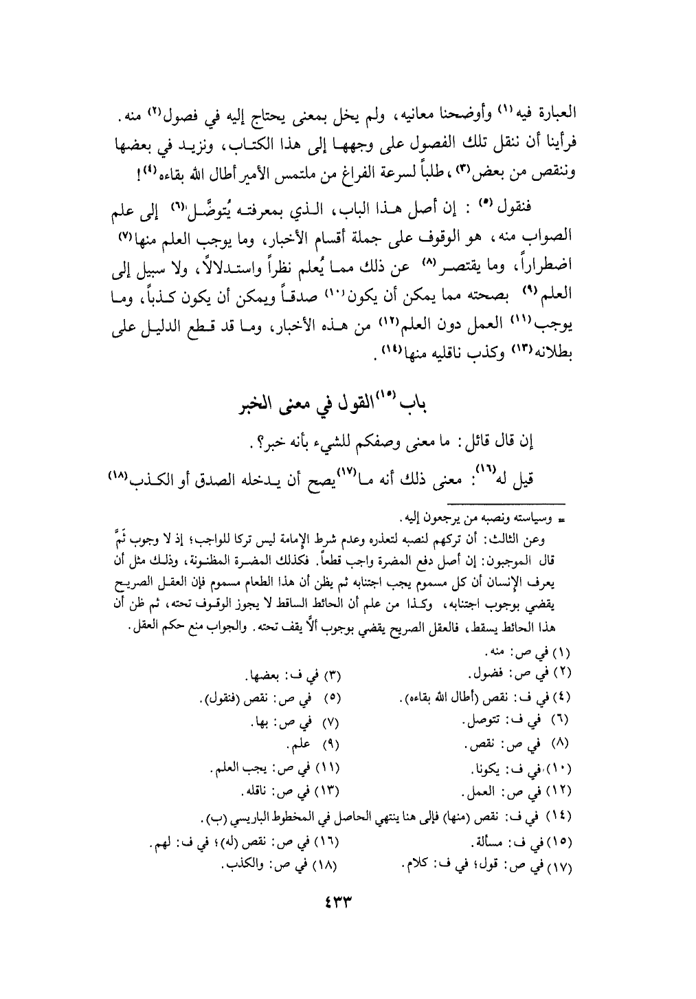 فَنَقُول إِن أصل هَذَا الْبَاب الَّذِي بمعرفته يتَوَصَّل إِلَى علم الصَّوَاب مِنْهُ هُوَ الْوُقُوف على جملَة أَقسَام الْأَخْبَار وَمَا يُوجب الْعلم مِنْهَا اضطرارا وَمَا يقْتَصر عَن ذَلِك مِمَّا يعلم نظرا واستدلالا وَلَا سَبِيل إِلَى الْعلم بِصِحَّتِهِ مِمَّا يُمكن أَن يكون صدقا وَيُمكن أَن يكون كذبا وَمَا يُوجب الْعَمَل دون الْعلم من هَذِه الْأَخْبَار وَمَا قد قطع الدَّلِيل على بُطْلَانه وَكذب ناقليه مِنْهَا