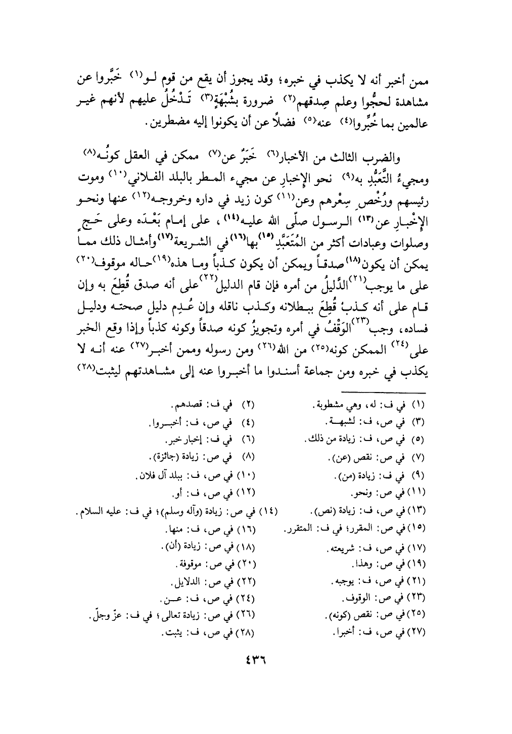 وَالضَّرْب الثَّالِث من الْأَخْبَار خبر عَن مُمكن فِي الْعقل كَونه ومجيء التَّعَبُّد بِهِ نَحْو الْإِخْبَار عَن مَجِيء الْمَطَر بِالْبَلَدِ الْفُلَانِيّ وَمَوْت رئيسهم وَرخّص سعرهم وَعَن كَون زيد فِي دَاره وَخُرُوجه عَنْهَا وَنَحْو الْإِخْبَار عَن الرَّسُول صلى الله عَلَيْهِ وَسلم على إِمَام بعده وعَلى حج وصلوات وعبادات أَكثر من المتعبد بهَا فِي الشَّرِيعَة وأمثال ذَلِك مِمَّا يُمكن أَن يكون صدقا وَيُمكن أَن يكون كذبا وَمَا هَذِه حَاله مَوْقُوف على مَا يُوجب الدَّلِيل من أمره فَإِن قَامَ الدَّلِيل على أَنه صدق قطع بِهِ وَإِن قَامَ على أَنه كذب قطع بِبُطْلَانِهِ وَكذب ناقله وَإِن عدم دَلِيل صِحَّته وَدَلِيل فَسَاده وَجب الْوَقْف فِي أمره وتجويز كَونه صدقا وَكَونه كذبا وَإِذا وَقع الْخَبَر على الْمُمكن كَونه من الله وَمن رَسُوله وَمِمَّنْ أخبر عَنهُ أَنه لَا يكذب فِي خَبره وَمن جمَاعَة أسندوا مَا أخبروا عَنهُ إِلَى مشاهدتهم ليثبت