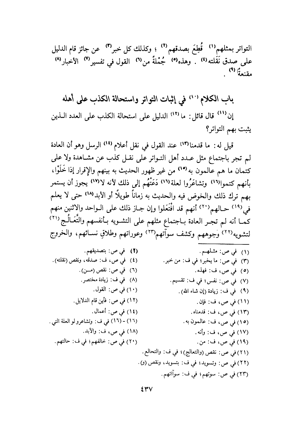 بَاب الْكَلَام فِي إِثْبَات التَّوَاتُر واستحالة الْكَذِب على أَهله