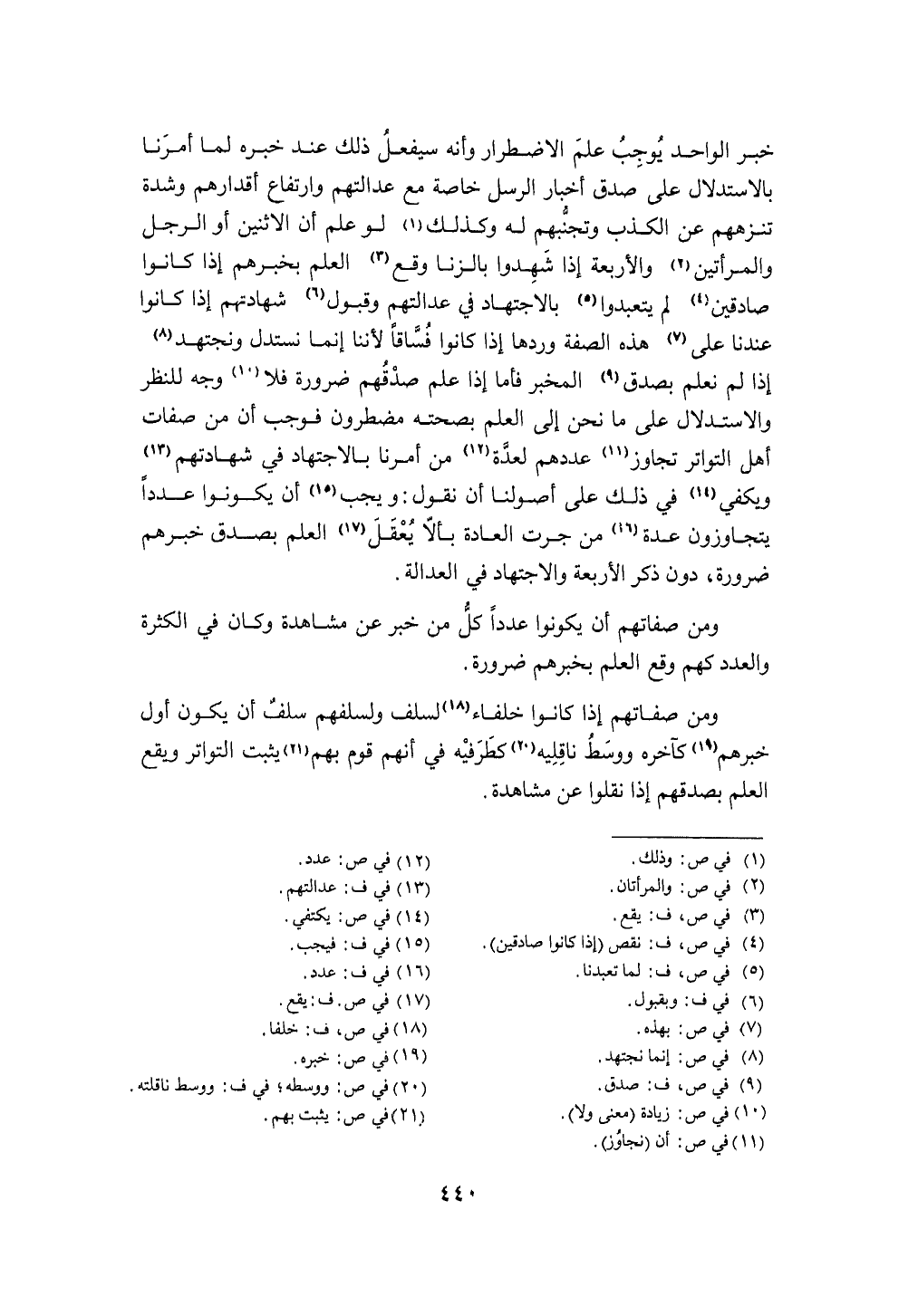 وَمن صفاتهم إِذا كَانُوا خلفاء لسلف ولسلفهم سلف أَن يكون أول خبرهم كآخره ووسط ناقليه كطرفيه فِي أَنهم قوم بهم يثبت التَّوَاتُر وَيَقَع الْعلم بصدقهم إِذا نقلوا عَن مُشَاهدَة