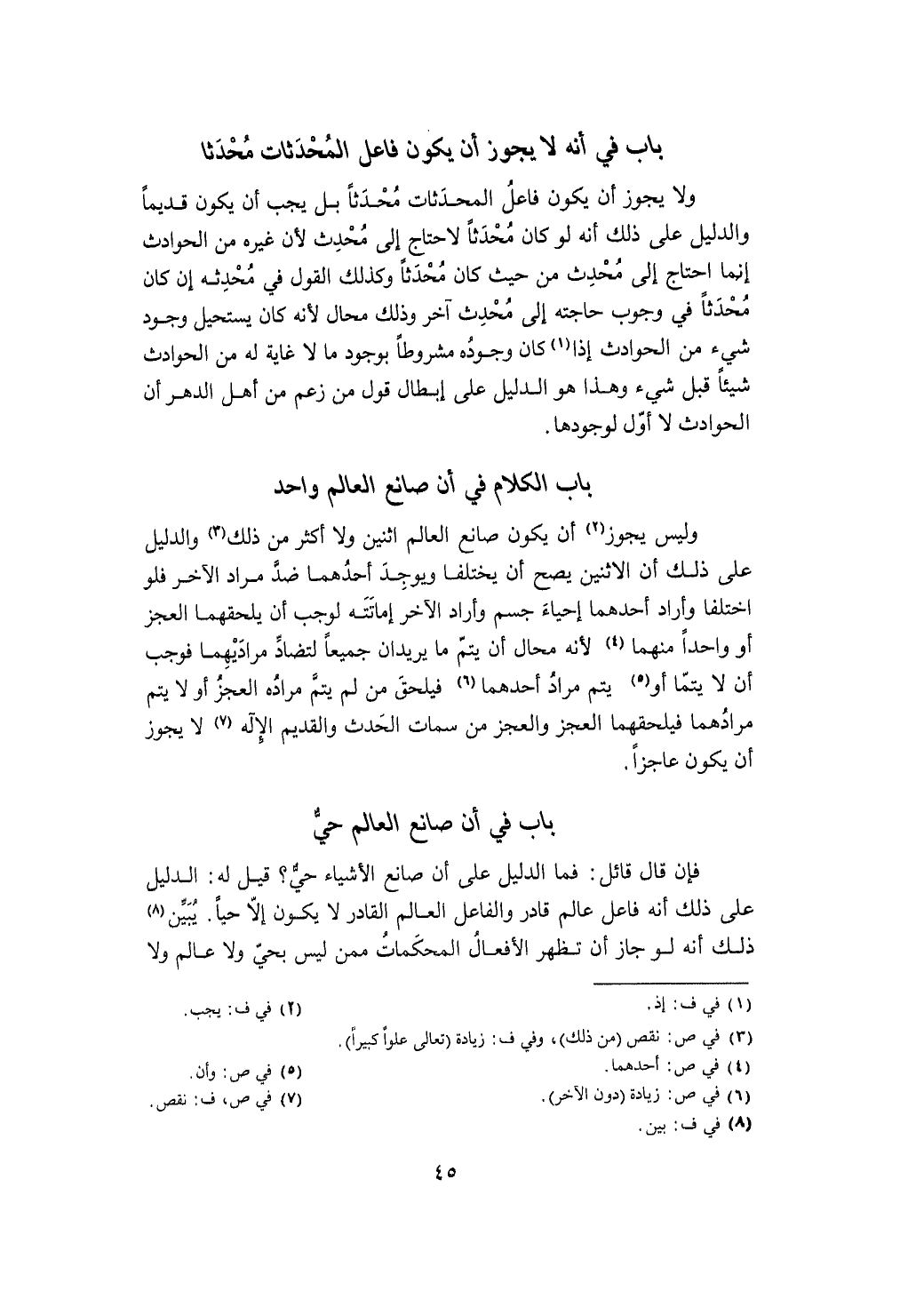 وَلَا يجوز أَن يكون فَاعل المحدثات مُحدثا بل يجب أَن يكون قَدِيما وَالدَّلِيل على ذَلِك أَنه لَو كَانَ مُحدثا لاحتاج إِلَى مُحدث لِأَن غَيره من الْحَوَادِث إِنَّمَا احْتَاجَ إِلَى مُحدث من حَيْثُ كَانَ مُحدثا وَكَذَلِكَ القَوْل فِي محدثه إِن كَانَ مُحدثا فِي وجوب حَاجته إِلَى مُحدث آخر وَذَلِكَ محَال لِأَنَّهُ كَانَ يَسْتَحِيل وجود شَيْء من الْحَوَادِث إِذا كَانَ وجوده مَشْرُوطًا بِوُجُود لَا غَايَة لَهُ من الْحَوَادِث شَيْئا قبل شَيْء وَهَذَا هُوَ الدَّلِيل على إبِْطَال قَول من زعم من أهل الدَّهْر أَن الْحَوَادِث لَا أول لوجودها
