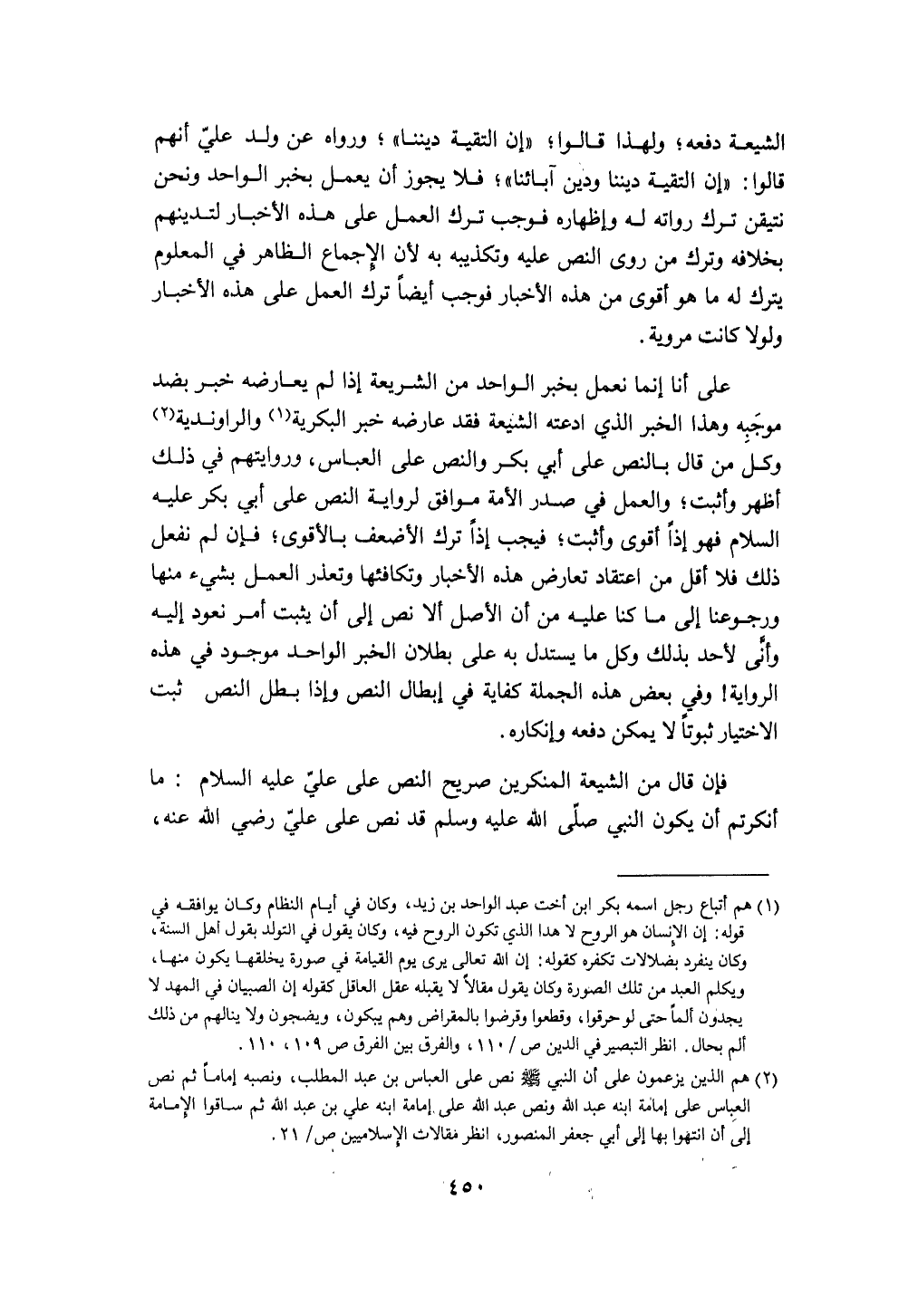 الشِّيعَة دَفعه وَلِهَذَا قَالُوا إِن التقية ديننَا وَرَوَاهُ عَن ولد عَليّ أَنهم قَالُوا إِن التقية ديننَا وَدين آبَائِنَا فَلَا يجوز أَن يعْمل بِخَبَر الْوَاحِد وَنحن نتيقن ترك رُوَاته لَهُ وإظهاره فَوَجَبَ ترك الْعَمَل على هَذِه الْأَخْبَار لتدينهم بخلافة وَترك من روى النَّص عَلَيْهِ وتكذيبه بِهِ لِأَن الْإِجْمَاع الظَّاهِر فِي الْمَعْلُوم يتْرك لَهُ مَا هُوَ أقوى من هَذِه الْأَخْبَار فَوَجَبَ أَيْضا ترك الْعَمَل على هَذِه الْأَخْبَار وَلَوْلَا كَانَت مروية