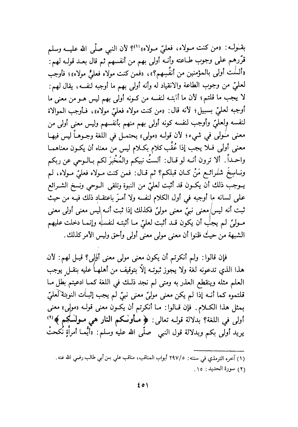 بقوله من كنت مَوْلَاهُ فعلي مَوْلَاهُ لِأَن النَّبِي صلى الله عَلَيْهِ وَسلم قررهم على وجوب طَاعَته وَأَنه أولى بهم من أنفسهم ثمَّ قَالَ بعد قَوْله لَهُم أَلَسْت أولى بِالْمُؤْمِنِينَ من أنفسهم فَمن كنت مَوْلَاهُ فعلي مَوْلَاهُ فَأوجب لعَلي من وجوب الطَّاعَة والانقياد لَهُ وَأَنه أولى بهم مَا أوجبه لنَفسِهِ يُقَال لَهُم لَا يجب مَا قُلْتُمْ لِأَن مَا أثْبته لنَفسِهِ من كَونه أولى بهم لَيْسَ هُوَ من معنى مَا أوجبه لعَلي بسبيل لِأَنَّهُ قَالَ من كنت مولاة فعلي مَوْلَاهُ فَأوجب الْمُوَالَاة لنَفسِهِ ولعلي وَأوجب لنَفسِهِ كَونه أولى بهم مِنْهُم بِأَنْفسِهِم وَلَيْسَ معنى أولى من معنى مولى فِي شَيْء لِأَن قَوْله مولى يحْتَمل فِي اللُّغَة وُجُوهًا لَيْسَ فِيهَا معنى أولى فَلَا يجب إِذا عقب كَلَام بِكَلَام لَيْسَ من مَعْنَاهُ أَن يكون مَعْنَاهُمَا وَاحِدًا