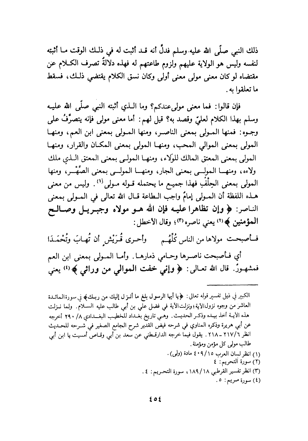 فَإِن قَالُوا فَمَا معنى مولى عنْدكُمْ وَمَا الَّذِي أثْبته النَّبِي صلى الله عَلَيْهِ وَسلم بِهَذَا الْكَلَام لعَلي وَقصد بِهِ قيل لَهُم أما معنى مولى فَإِنَّهُ يتَصَرَّف على وُجُوه فَمِنْهَا الْمولى بِمَعْنى النَّاصِر وَمِنْهَا الْمولى بِمَعْنى ابْن الْعم وَمِنْهَا الْمولى بِمَعْنى الموَالِي الْمُحب وَمِنْهَا الْمولى بِمَعْنى الْمَكَان والقرار وَمِنْهَا الْمولى بِمَعْنى الْمُعْتق الْمَالِك للولاء وَمِنْهَا الْمولى بِمَعْنى الْمُعْتق الَّذِي ملك ولاءه وَمِنْهَا الْمولى بِمَعْنى الْجَار وَمِنْهَا الْمولى بِمَعْنى الصهر وَمِنْهَا الْمولى بِمَعْنى الْحلف فَهَذَا جَمِيع مَا يحْتَملهُ قَوْله مولى