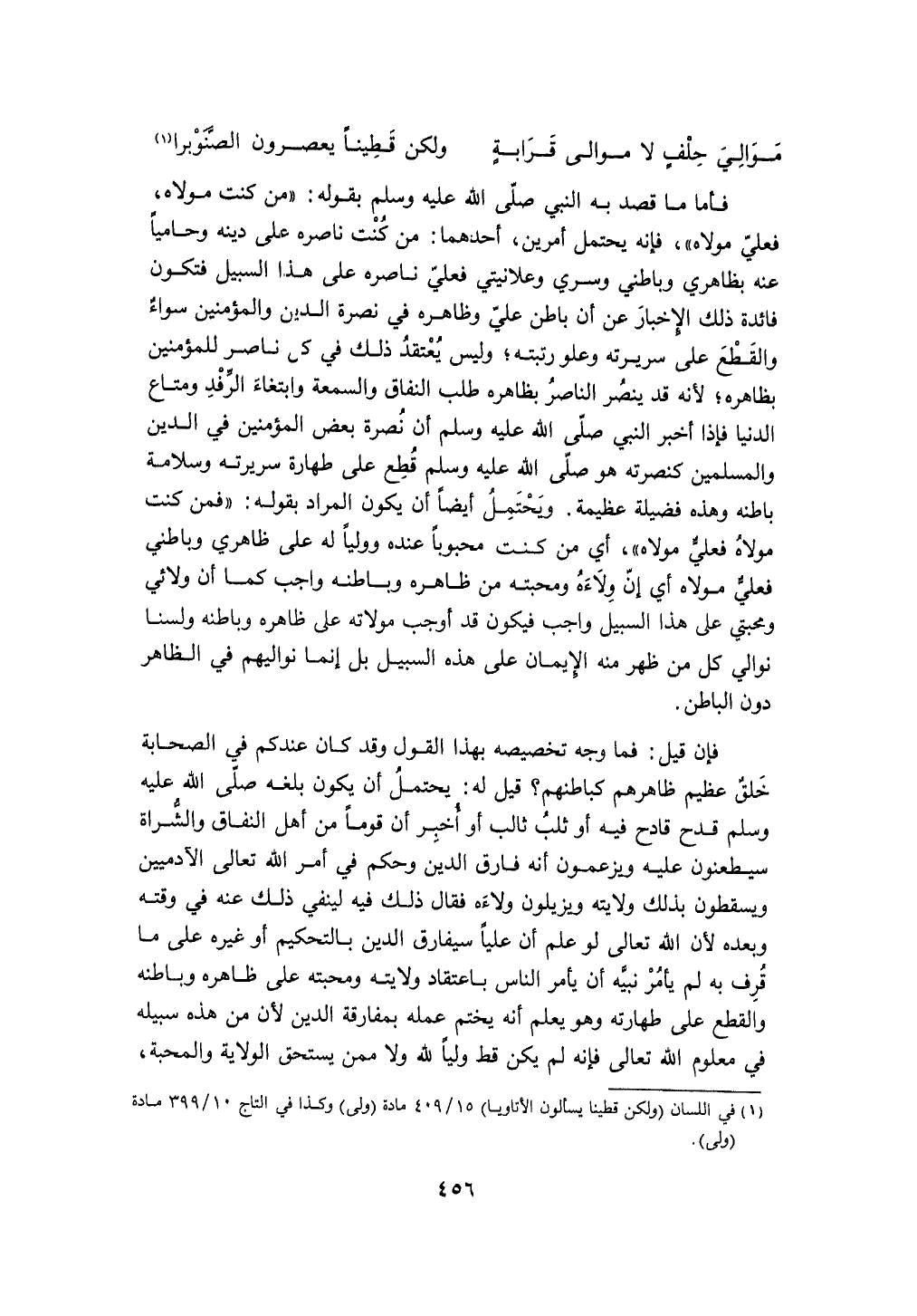 (موَالِي حلف لَا موَالِي قرَابَة ... وَلَكِن قطينا يعصرون الصنوبرا) فَأَما مَا قصد بِهِ النَّبِي صلى الله عَلَيْهِ وَسلم بقوله (من كنت مَوْلَاهُ فعلي مَوْلَاهُ) فَإِنَّهُ يحْتَمل أَمريْن أَحدهمَا من كنت ناصره على دينه وحاميا عَنهُ بظاهري وباطني وسري وعلانيتي فعلي ناصره على هَذَا السَّبِيل فَتكون فَائِدَة ذَلِك الْإِخْبَار عَن أَن بَاطِن عَليّ وَظَاهره فِي نصْرَة الدّين وَالْمُؤمنِينَ سَوَاء وَالْقطع على سَرِيرَته وعلو رتبته وَلَيْسَ يعْتَقد ذَلِك فِي كن نَاصِر للْمُؤْمِنين بِظَاهِرِهِ لِأَنَّهُ قد ينصر النَّاصِر بِظَاهِرِهِ طلب النِّفَاق والسمعة وابتغاء الرفد ومتاع الدُّنْيَا فَإِذا أخبر النَّبِي صلى الله عَلَيْهِ وَسلم أَن نصْرَة بعض الْمُؤمنِينَ فِي الدّين وَالْمُسْلِمين كنصرته هُوَ صلى الله عَلَيْهِ وَسلم قطع على طَهَارَة سَرِيرَته وسلامة بَاطِنه وَهَذِه فَضِيلَة عَظِيمَة
