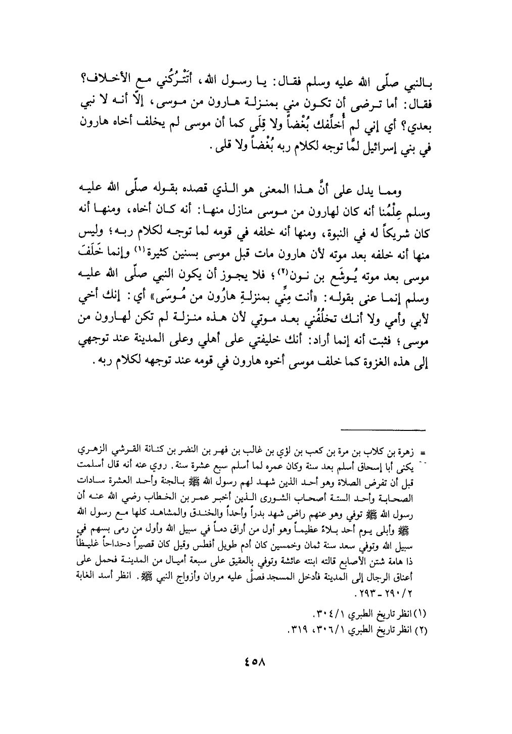 وَمِمَّا يدل على أَن هَذَا الْمَعْنى هُوَ الَّذِي قَصده بقوله صلى الله عَلَيْهِ وَسلم علمنَا أَنه كَانَ لهارون من مُوسَى منَازِل مِنْهَا أَنه كَانَ أَخَاهُ وَمِنْهَا أَنه كَانَ شَرِيكا لَهُ فِي النُّبُوَّة وَمِنْهَا أَنه خَلفه فِي قومه لما توجه لكَلَام ربه وَلَيْسَ مِنْهَا أَنه خَلفه بعد مَوته لِأَن هَارُون مَاتَ قبل مُوسَى بسنين كَثِيرَة وَإِنَّمَا خلف مُوسَى بعد مَوته يُوشَع بن نون فَلَا يجوز أَن يكون النَّبِي صلى الله عَلَيْهِ وَسلم إِنَّمَا عَنى بقوله (أَنْت مني بِمَنْزِلَة هَارُون من مُوسَى) أَي إِنَّك أخي لأبي وَأمي وَلَا أَنَّك تخلفني بعد موتِي لِأَن هَذِه منزلَة لم تكن لهارون من مُوسَى فَثَبت أَنه إِنَّمَا أَرَادَ خليفتي على أَهلِي وعَلى الْمَدِينَة عِنْد تَوَجُّهِي إِلَى هَذِه الْغَزْوَة كَمَا خلف مُوسَى أَخُوهُ هَارُون فِي قومه عِنْد توجهه لكَلَام ربه