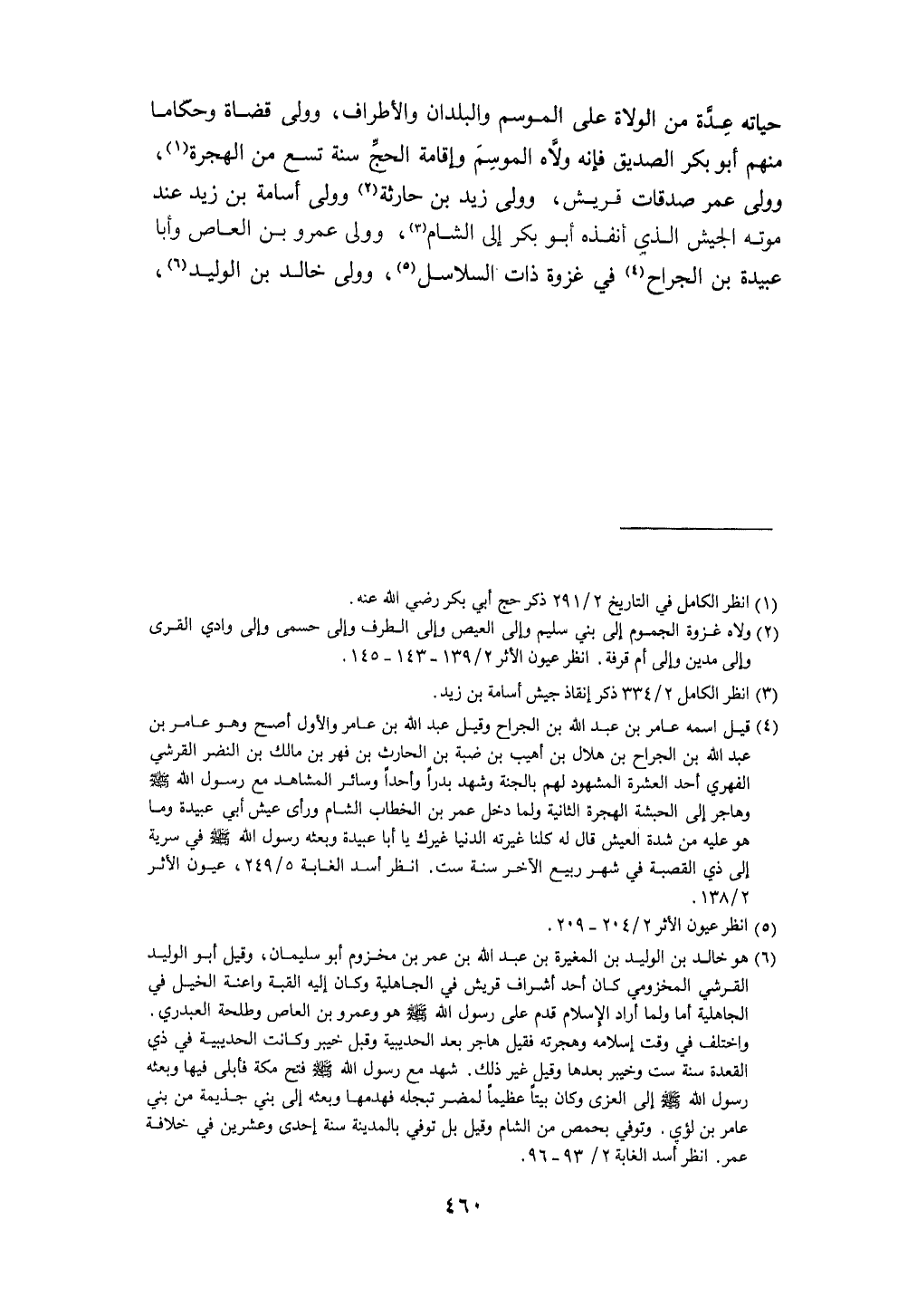 حَيَاته عدَّة من الْوُلَاة على الْمَوْسِم والبلدان والأطراف وَولى قُضَاة وحكاما مِنْهُم أَبُو بكر الصّديق فَإِنَّهُ ولاه الْمَوْسِم وَإِقَامَة الْحَج سنة تسع من الْهِجْرَة وَولى عمر صدقَات قُرَيْش وَولى زيد بن حَارِثَة وَولى أُسَامَة بن زيد عِنْد مَوته الْجَيْش الَّذِي أنفذه أَبُو بكر إِلَى الشَّام وَولى عَمْرو بن الْعَاصِ وَأَبا عبيده بن الْجراح فِي غَزْوَة ذَات السلَاسِل وَولى خَالِد بن الْوَلِيد