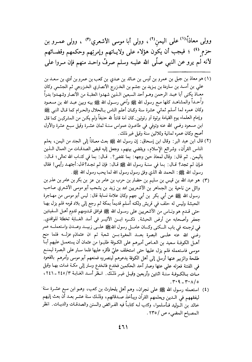 وَولى معَاذًا على الْيمن وَولى أَبَا مُوسَى الْأَشْعَرِيّ وَولى عَمْرو بن حزم فَيجب أَن يكون هَؤُلَاءِ على ولاياتهم وإمرتهم وحكمهم وقضائهم لِأَنَّهُ لم يرو عَن النَّبِي صلى الله عَلَيْهِ وَسلم صرف وَاحِد مِنْهُم فَإِن مروا على