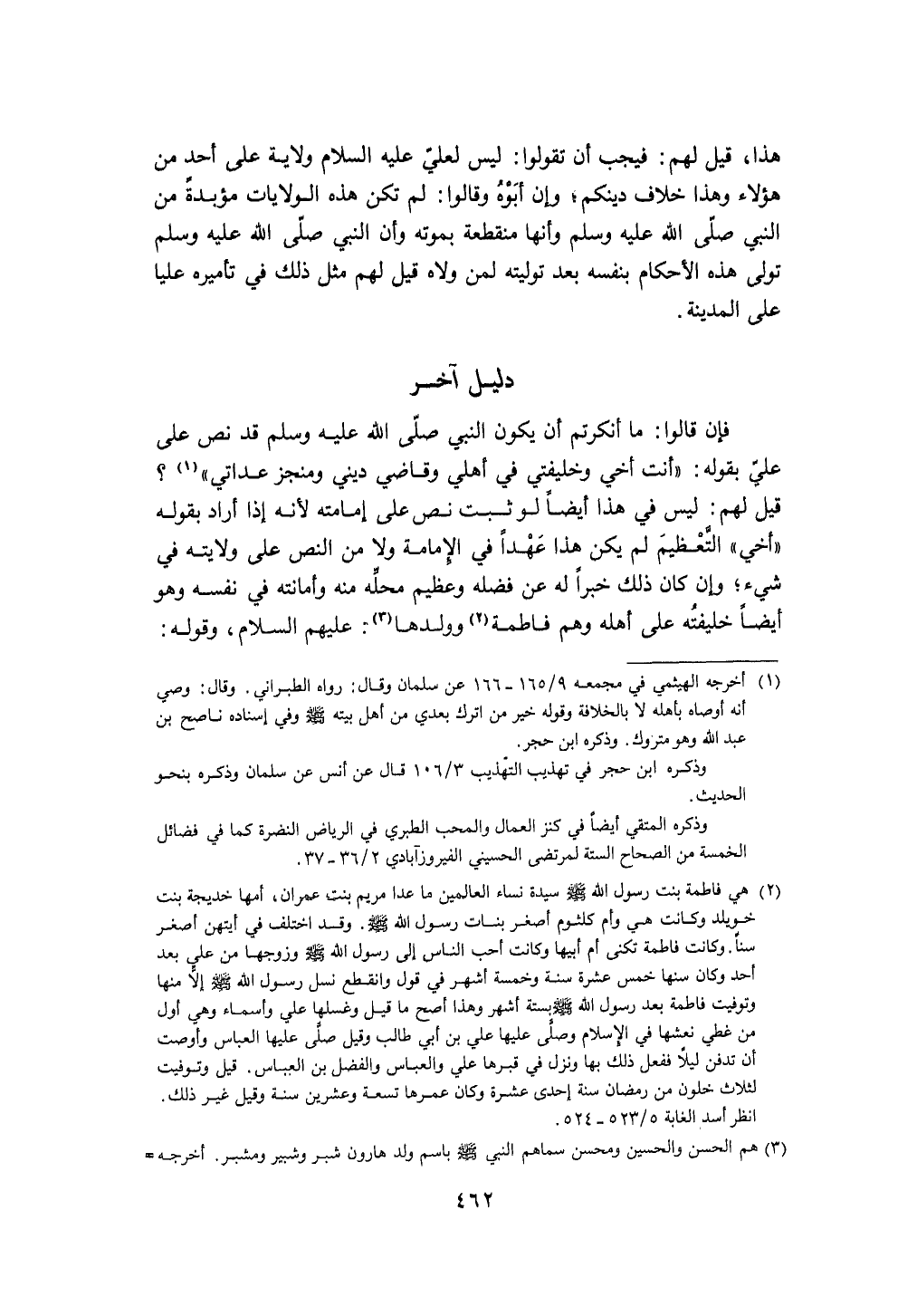 هَذَا قيل لَهُم فَيجب أَن تَقولُوا لَيْسَ لعَلي عَلَيْهِ السَّلَام ولَايَة على أحد من هَؤُلَاءِ وَهَذَا خلاف دينكُمْ وَإِن أَبوهُ وَقَالُوا لم تكن هَذِه الولايات مُؤَبّدَة من النَّبِي صلى الله عَلَيْهِ وَسلم وَأَنَّهَا مُنْقَطِعَة بِمَوْتِهِ وَأَن النَّبِي صلى الله عَلَيْهِ وَسلم تولى هَذِه الْأَحْكَام بِنَفسِهِ بعد تَوليته لمن ولاه قيل لَهُم مثل ذَلِك فِي تأميره عليا على الْمَدِينَة