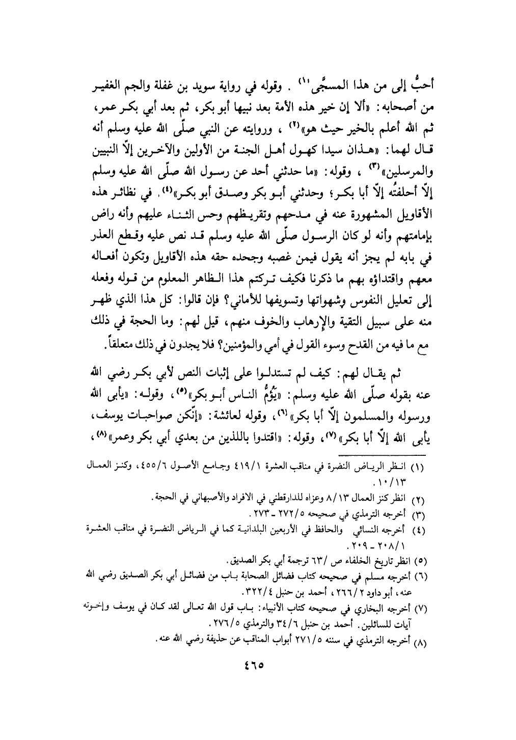 وَقَوله فِي رِوَايَة سُوَيْد بن غَفلَة والجم الْغَفِير من أَصْحَابه أَلا إِن خير هَذِه الْأمة بعد نبيها أَبُو بكر ثمَّ بعد أبي بكر عمر ثمَّ الله أعلم بِالْخَيرِ حَيْثُ هُوَ وَرِوَايَته عَن النَّبِي صلى الله عَلَيْهِ وَسلم أَنه قَالَ لَهما (هَذَانِ سيدا كهول أهل الْجنَّة من الْأَوَّلين والآخرين إِلَّا النَّبِيين وَالْمُرْسلِينَ) وَقَوله مَا حَدثنِي أحد عَن رَسُول الله صلى الله عَلَيْهِ وَسلم إِلَّا أحلفته إِلَّا أَبَا بكر وحَدثني أَبُو بكر وَصدق أَبُو بكر فِي نَظَائِر هَذِه الْأَقَاوِيل الْمَشْهُورَة عَنهُ فِي مدحهم وتقريظهم وحس الثَّنَاء عَلَيْهِم وَأَنه رَاض بإمامتهم وَأَنه لَو كَانَ الرَّسُول صلى الله عَلَيْهِ وَسلم قد نَص عَلَيْهِ وَقطع الْعذر فِي بَابه لم يجز أَنه يَقُول فِيمَن غصبه وجحده حَقه هَذِه الْأَقَاوِيل وَتَكون أَفعاله مَعَهم واقتداؤه بهم مَا ذكرنَا فَكيف تركْتُم هَذَا الظَّاهِر الْمَعْلُوم من قَوْله وَفعله إِلَى تَعْلِيل النُّفُوس وشهواتها وتسويفها للأماني فَإِن قَالُوا كل هَذَا الَّذِي ظهر مِنْهُ على سَبِيل التقية والإرهاب وَالْخَوْف مِنْهُم قيل لَهُم وَمَا الْحجَّة فِي ذَلِك مَعَ مَا فِيهِ من الْقدح وَسُوء القَوْل فِي أُمِّي وَالْمُؤمنِينَ فَلَا يَجدونَ فِي ذَلِك مُتَعَلقا