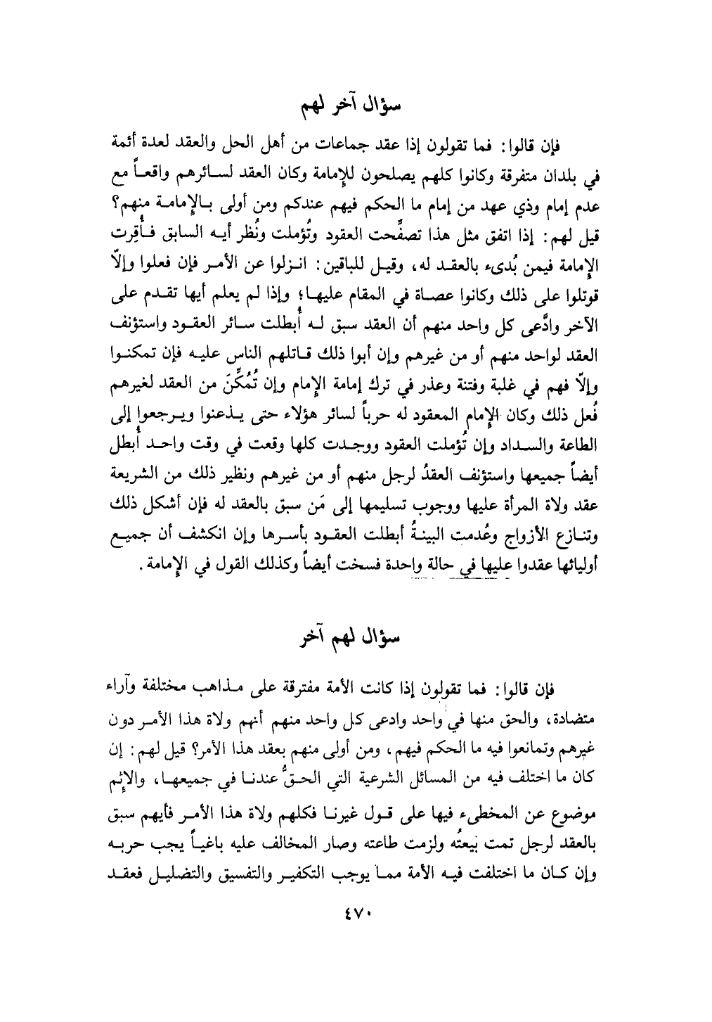 فَإِن قَالُوا فَمَا تَقولُونَ إِذا عقد جماعات من أهل الْحل وَالْعقد لعدة أَئِمَّة فِي بلدان مُتَفَرِّقَة وَكَانُوا كلهم يصلحون للْإِمَامَة وَكَانَ العقد لسائرهم وَاقعا مَعَ عدم إِمَام وَذي عهد من إِمَام مَا الحكم فيهم عنْدكُمْ وَمن أولى بِالْإِمَامَةِ مِنْهُم قيل لَهُم إِذا اتّفق مثل هَذَا تصفحت الْعُقُود وتؤملت وَنظر أيه السَّابِق فأقرت الْإِمَامَة فِيمَن بدىء بِالْعقدِ لَهُ وَقيل للباقين انزلوا عَن الْأَمر فَإِن فعلوا وَإِلَّا قوتلوا على ذَلِك وَكَانُوا عصاة فِي الْمقَام عَلَيْهَا وَإِذا لم يعلم أَيهَا تقدم على الآخر وَادّعى كل وَاحِد مِنْهُم أَن العقد سبق لَهُ أبطلت سَائِر الْعُقُود واستؤنف العقد لوَاحِد مِنْهُم أَو من غَيرهم وَإِن أَبُو ذَلِك قَاتلهم النَّاس عَلَيْهِ فَإِن تمكنوا وَإِلَّا فهم فِي غَلَبَة وفتنة وَعذر فِي ترك إِمَامَة الإِمَام وَإِن تمكن من العقد لغَيرهم فعل ذَلِك وَكَانَ الإِمَام الْمَعْقُود لَهُ حَربًا لسَائِر هَؤُلَاءِ حَتَّى يذعنوا ويرجعوا إِلَى الطَّاعَة والسداد وَإِن تؤملت الْعُقُود وَوجدت كلهَا وَقعت فِي وَقت وَاحِد أبطل أَيْضا جَمِيعهَا واستؤنف العقد لرجل مِنْهُم أَو من غَيرهم وَنَظِير ذَلِك من الشَّرِيعَة عقد وُلَاة الْمَرْأَة عَلَيْهَا وَوُجُوب تَسْلِيمهَا إِلَى من سبق بِالْعقدِ لَهُ فَإِن أشكل ذَلِك وتنازع الْأزْوَاج وعدمت الْبَيِّنَة أبطلت الْعُقُود بأسرها وَإِن انْكَشَفَ أَن جَمِيع أوليائها عقدوا عَلَيْهَا فِي حَالَة وَاحِدَة فسخت أَيْضا وَكَذَلِكَ القَوْل فِي الْإِمَامَة