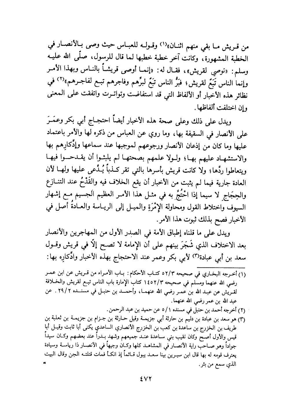 من قُرَيْش مَا بَقِي مِنْهُم اثْنَان) وَقَوله للْعَبَّاس حَيْثُ وصّى بالأنصار فِي الْخطْبَة الْمَشْهُورَة وَكَانَت آخر خطْبَة خطبهَا لما قَالَ للرسول صلى الله عَلَيْهِ وَسلم (توصي لقريش) فَقَالَ لَهُ (إِنَّمَا أوصى قُريْشًا بِالنَّاسِ وَبِهَذَا الْأَمر وَإِنَّمَا النَّاس تبع لقريش فبر النَّاس تبع لبرهم وفاجرهم تبع لفاجرهم فِي نَظَائِر هَذِه الْأَخْبَار أَو الْأَلْفَاظ الَّتِي قد استفاضت وتواترت واتفقت على الْمَعْنى وَإِن اخْتلفت ألفاظها