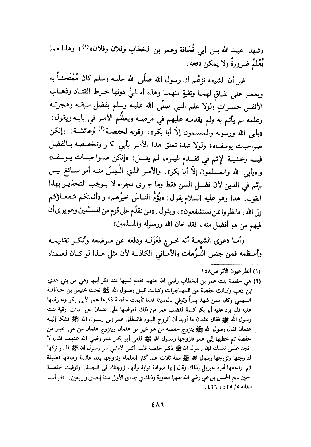 غير أَن الشِّيعَة تزْعم أَن رَسُول الله صلى الله عَلَيْهِ وَسلم كَانَ ممتحنا بِهِ وبعمر على نفاق لَهما وتقية مِنْهُمَا وَهَذِه أماني دونهَا خرط القتاد وَذَهَاب الْأَنْفس حسرات وَلَوْلَا علم النَّبِي صلى الله عَلَيْهِ وَسلم بِفضل سبقه وهجرته وَعلمه لم يأتم بِهِ وَلم يقدمهُ عَلَيْهِم فِي مَرضه ويعظم الْأَمر فِي بَابه وَيَقُول يَأْبَى الله وَرَسُوله والمسلمون إِلَّا أَبَا بكر وَقَوله لحفصة وَعَائِشَة (إنكن صواحبات يُوسُف) وَلَوْلَا شدَّة تعلق هَذَا الْأَمر بِأبي بكر وتخصصه بِالْفَضْلِ فِيهِ وخشية الْإِثْم فِي تقدم غَيره لم يقل إنكن صواحبات يُوسُف ويأبى الله والمسلمون إِلَّا أَبَا بكر