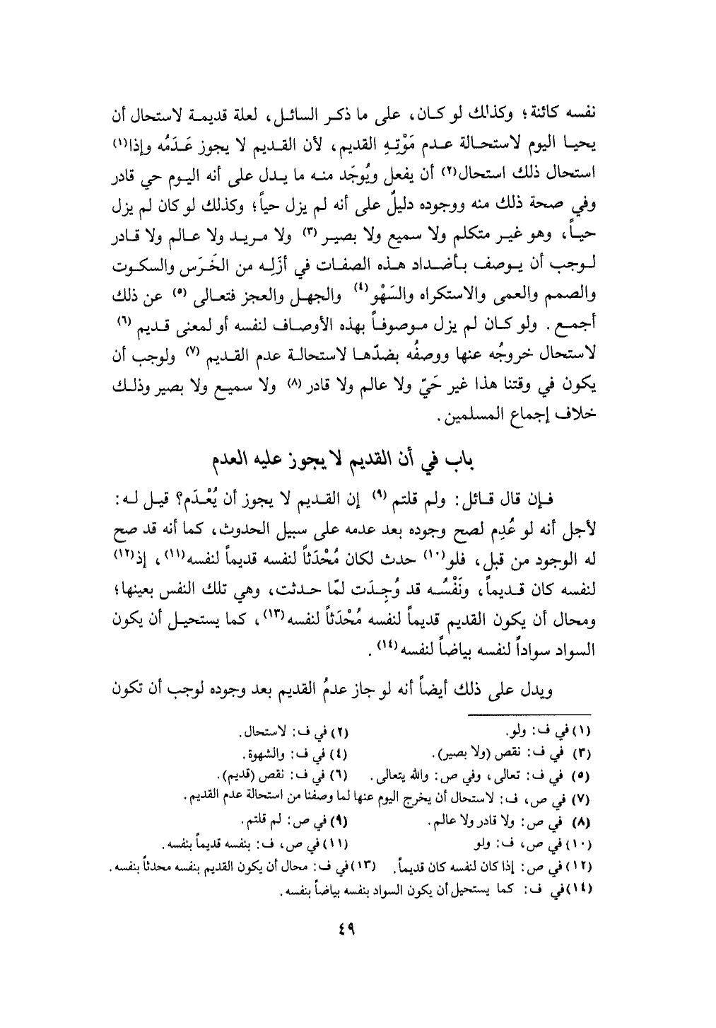 فَإِن قَالَ قَائِل وَلم قُلْتُمْ إِن الْقَدِيم لَا يجوز أَن يعْدم قيل لَهُ لأجل أَنه لَو عدم لصَحَّ وجوده بعد عَدمه على سَبِيل الْحُدُوث كَمَا أَنه قد صَحَّ لَهُ الْوُجُود من قبل فَلَو حدث لَكَانَ مُحدثا لنَفسِهِ قَدِيما لنَفسِهِ إِذْ لنَفسِهِ كَانَ قَدِيما وَنَفسه قد وجدت لما حدثت وَهِي تِلْكَ النَّفس بِعَينهَا ومحال أَن يكون الْقَدِيم قَدِيما لنَفسِهِ مُحدثا لنَفسِهِ كَمَا يَسْتَحِيل أَن يكون السوَاد سوادا لنَفسِهِ بَيَاضًا لنَفسِهِ
