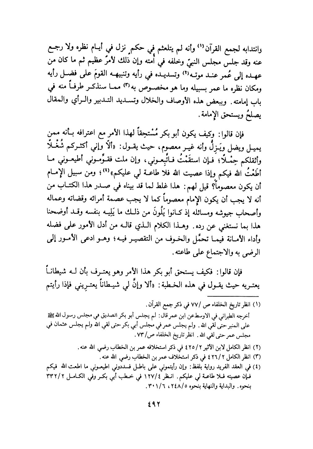 فَإِن قَالُوا وَكَيف يكون أَبُو بكر مُسْتَحقّا لهَذَا الْأَمر مَعَ اعترافه بِأَنَّهُ مِمَّن يمِيل ويضل ويزل وَأَنه غير مَعْصُوم حَيْثُ يَقُول أَلا وَإِنِّي أَكْثَرَكُم شغلا وأثقلكم حملا فَإِن اسْتَقَمْت فَاتبعُوني وَإِن ملت فقوموني أَطِيعُونِي مَا أَطَعْت الله فِيكُم وَإِذا عصيت الله فَلَا طَاعَة لي عَلَيْكُم وَمن سَبِيل الإِمَام أَن يكون مَعْصُوما قيل لَهُم هَذَا غلط لما قد بَيناهُ فِي صدر هَذَا الْكتاب من أَنه لَا يجب أَن يكون الإِمَام مَعْصُوما كَمَا لَا يجب عصمَة أمرائه وقضاته وعماله وَأَصْحَاب جيوشه ومسائله إِذْ كَانُوا يلون من ذَلِك مَا يَلِيهِ بِنَفسِهِ وَقد أوضحنا هَذَا بِمَا نستغني عَن رده