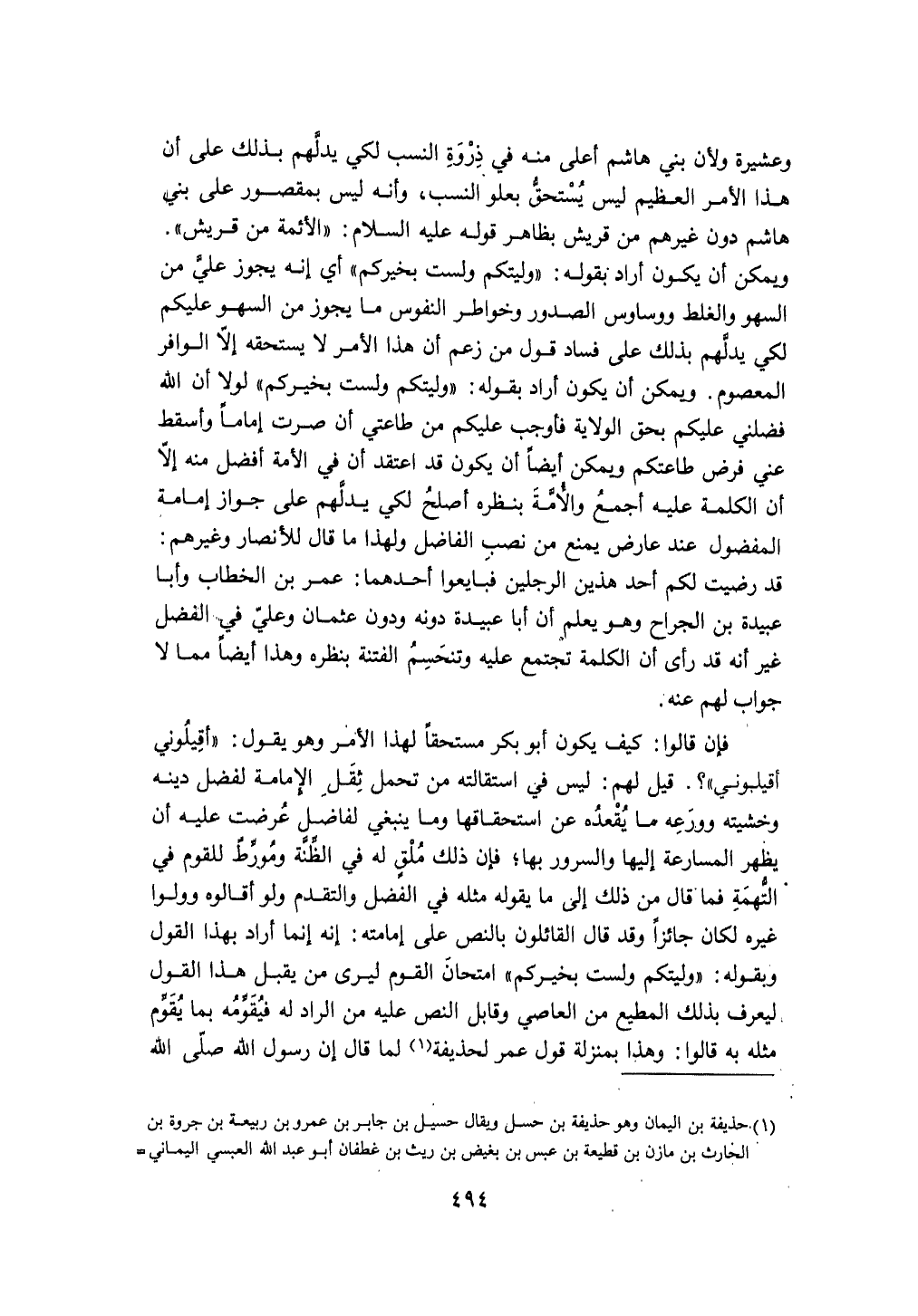 قيل لَهُم لَيْسَ فِي استقالته من تحمل ثقل الْإِمَامَة لفضل دينه وخشيته وورعه مَا يقعده عَن اسْتِحْقَاقهَا وَمَا يَنْبَغِي لفاضل عرضت عَلَيْهِ أَن يظْهر المسارعة إِلَيْهَا وَالسُّرُور بهَا فَإِن ذَلِك ملق لَهُ فِي الظنة ومورط للْقَوْم فِي التُّهْمَة فَمَا قَالَ من ذَلِك إِلَى مَا يَقُوله مثله فِي الْفضل والتقدم وَلَو أقالوه وولوا غَيره لَكَانَ جَائِزا وَقد قَالَ الْقَائِلُونَ بِالنَّصِّ على إِمَامَته إِنَّه إِنَّمَا أَرَادَ بِهَذَا القَوْل وَبِقَوْلِهِ وليتكُمْ وَلست بِخَيْرِكُمْ امتحان الْقَوْم ليرى من يقبل هَذَا القَوْل ليعرف بذلك الْمُطِيع من العَاصِي وقابل النَّص عَلَيْهِ من الرَّاد لَهُ فيقومه بِمَا يقوم مثله بِهِ قَالُوا وَهَذَا بِمَنْزِلَة قَول عمر لِحُذَيْفَة لما قَالَ إِن رَسُول الله صلى الله عَلَيْهِ وَسلم