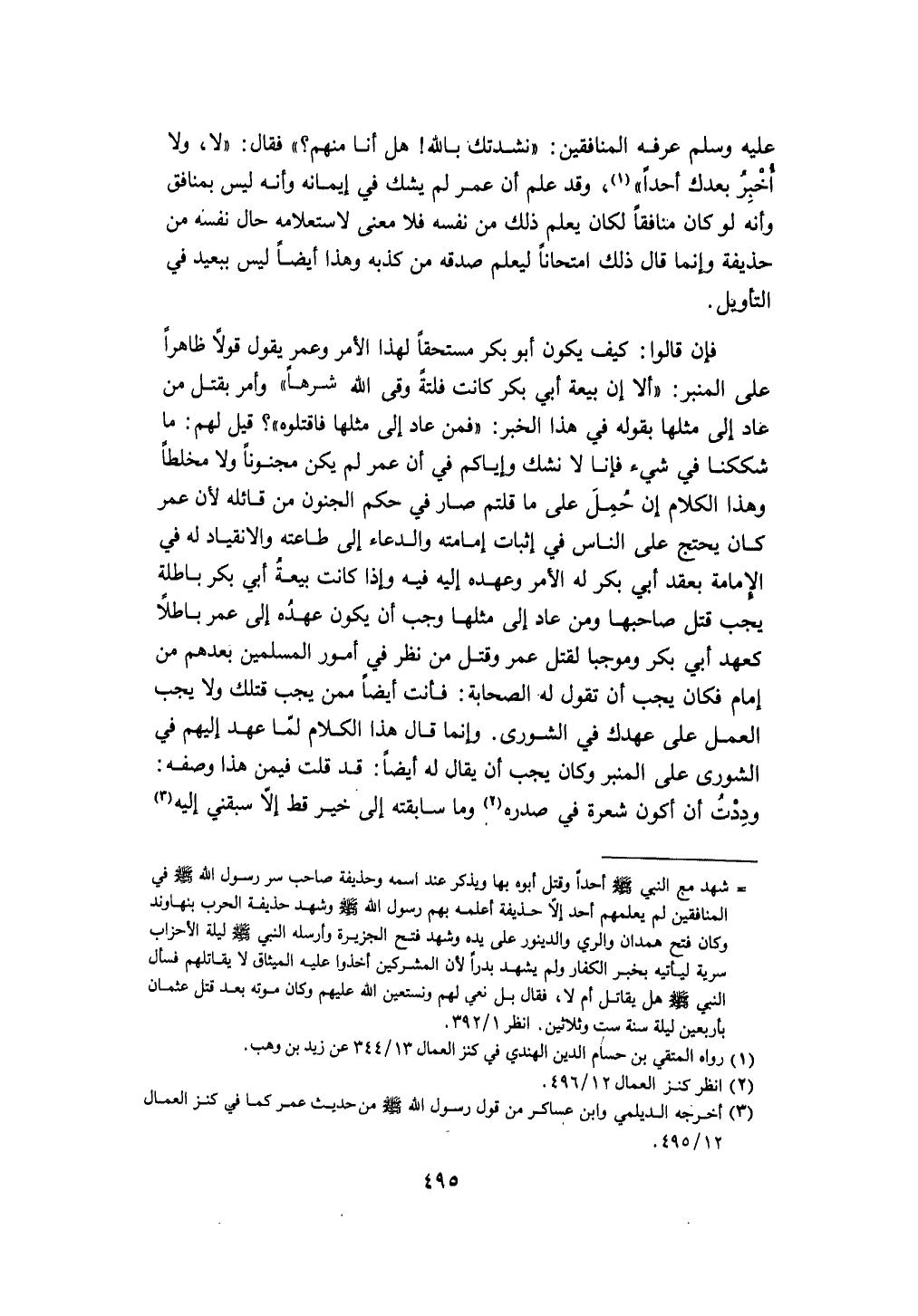 فَإِن قَالُوا كَيفَ يكون أَبُو بكر مُسْتَحقّا لهَذَا الْأَمر وَعمر يَقُول قولا ظَاهرا على الْمِنْبَر أَلا إِن بيعَة أبي بكر كَانَت فلتة وقى الله شَرها وَأمر بقتل من عَاد إِلَى مثلهَا بقوله فِي هَذَا الْخَبَر فَمن عَاد إِلَى مثلهَا فَاقْتُلُوهُ قيل لَهُم مَا شككنا فِي شَيْء فَإنَّا لَا نشك وَإِيَّاكُم فِي أَن عمر لم يكن مَجْنُونا وَلَا مخلطا وَهَذَا الْكَلَام إِن حمل على مَا قُلْتُمْ صَار فِي حكم الْجُنُون من قَائِله لِأَن عمر كَانَ يحْتَج على النَّاس فِي إِثْبَات إِمَامَته وَالدُّعَاء إِلَى طَاعَته والانقياد لَهُ فِي الْإِمَامَة بِعقد أبي بكر لَهُ الْأَمر وَعَهده إِلَيْهِ فِيهِ وَإِذا كَانَت بيعَة أبي بكر بَاطِلَة يجب قتل صَاحبهَا وَمن عَاد إِلَى مثلهَا وَجب أَن يكون عَهده إِلَى عمر بَاطِلا كعهد أبي بكر وموجبا لقتل عمر وَقتل من نظر فِي أُمُور الْمُسلمين بعدهمْ من إِمَام فَكَانَ يجب أَن تَقول لَهُ الصَّحَابَة فَأَنت أَيْضا مِمَّن يجب قَتلك وَلَا يجب الْعَمَل على عَهْدك فِي الشورى