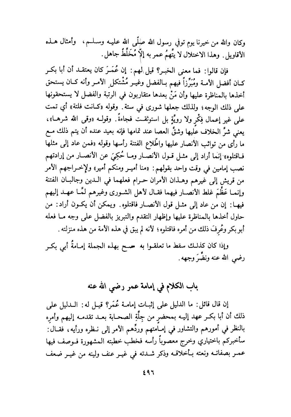 فَإِن قَالُوا فَمَا معنى الْخَبَر قيل لَهُم إِن عمر كَانَ يعْتَقد أَن أَبَا بكر كَانَ أفضل الْأمة ومبرزا فيهم بِالْفَضْلِ وَغير مشتكل الْأَمر وَأَنه كَانَ يسْتَحق أَخذهَا بالمناظرة عَلَيْهَا وَأَن من بعْدهَا متقاربون فِي الرُّتْبَة وَالْفضل لَا يستحقونها على ذَلِك الْوَجْه وَلذَلِك جعلهَا شُورَى فِي سِتَّة