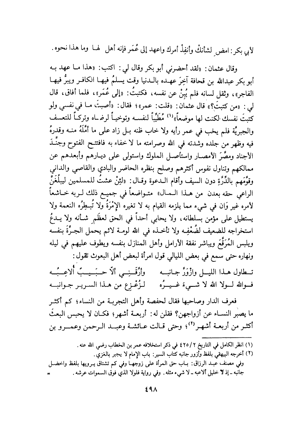 (فوَاللَّه لَوْلَا الله لَا شَيْء غَيره ... لزعزع من هَذَا السرير جوانبه) فَعرف الدَّار وصاحبها فَقَالَ لحفصة وَأهل التجربة من النِّسَاء كم أَكثر مَا يصبر النِّسَاء عَن أَزوَاجهنَّ فَقُلْنَ لَهُ أَرْبَعَة أشهر فَكَانَ لَا يحبس الْبَعْث أَكثر من أَرْبَعَة أشهر وَحَتَّى قَالَت عَائِشَة وَعبد الرَّحْمَن وَعَمْرو بن