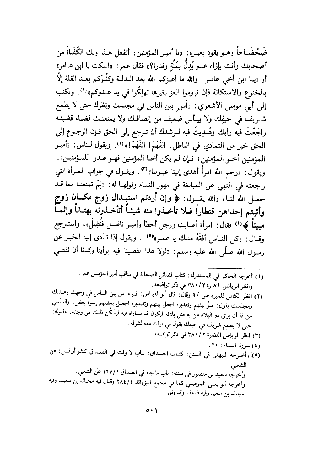 وَيَقُول فِي جَوَاب الْمَرْأَة الَّتِي راجعته فِي النَّهْي عَن الْمُبَالغَة فِي مُهُور النِّسَاء وَقَوْلها لَهُ لم تَمْنَعنَا مِمَّا قد جعل الله لنا وَالله يَقُول {وَإِن أردتم استبدال زوج مَكَان زوج وَآتَيْتُم إِحْدَاهُنَّ قِنْطَارًا فَلَا تَأْخُذُوا مِنْهُ شَيْئا أتأخذونه بهتانا وإثما مُبينًا} فَقَالَ امْرَأَة أَصَابَت وَرجل أَخطَأ وأمير ناضل فنضل واسترجع وَقَالَ كل النَّاس أفقه مِنْك يَا عمر