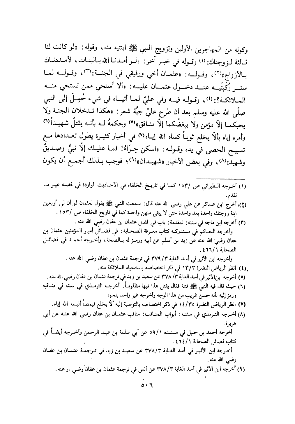 وَكَونه من الْمُهَاجِرين الْأَوَّلين وتزويج النَّبِي صلى الله عَلَيْهِ وَسلم ابْنَتَيْهِ مِنْهُ وَقَوله (لَو كَانَت لنا ثَالِثَة لزوجناك) وَقَوله فِي خبر آخر (لَو أمدنا الله بالبنات لأمددناك بالأزواج) وَقَوله (عُثْمَان أخي ورفيقي فِي الْجنَّة) وَقَوله لما ستر رُكْبَتَيْهِ عِنْد دُخُول عُثْمَان عَلَيْهِ (أَلا أستحي مِمَّن تَسْتَحي مِنْهُ الْمَلَائِكَة) وَقَوله فِيهِ وَفِي عَليّ لما أَتَيَاهُ فِي شَيْء حمل إِلَى النَّبِي صلى الله عَلَيْهِ وَسلم بعد أَن طرح عَليّ جُبَّة شعر (هَكَذَا تدخلان الْجنَّة وَلَا يحبكما إِلَّا مُؤمن وَلَا يبغضكما إِلَّا مُنَافِق) وَحكمه لَهُ بِأَنَّهُ يقتل شَهِيدا وَأمره إِيَّاه بألا يخلع ثوبا كَسَاه الله إِيَّاه فِي أَخْبَار كَثِيرَة يطول تعدادها مَعَ تَسْبِيح الْحَصَى فِي يَده وَقَوله (اسكن حراء فَمَا عَلَيْك إِلَّا نَبِي وصديق وشهيد) وَفِي بعض الْأَخْبَار شهيدان فَوَجَبَ بذلك أجمع أَن يكون