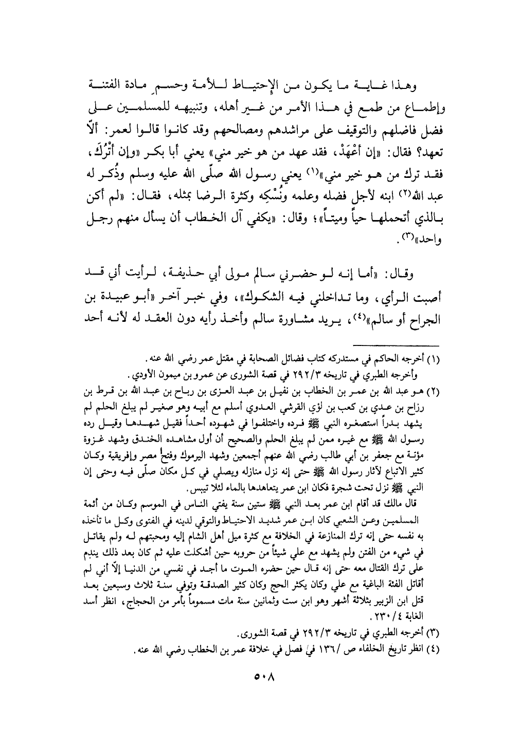 وَقَالَ أما إِنَّه لَو حضرني سَالم مولى أبي حُذَيْفَة لرأيت أَنِّي قد أصبت الرَّأْي وَمَا تداخلني فِيهِ الشكوك وَفِي خبر آخر أَبُو عُبَيْدَة بن الْجراح أَو سَالم يُرِيد مُشَاورَة سَالم وَأخذ رَأْيه دون العقد لَهُ لِأَنَّهُ أحد