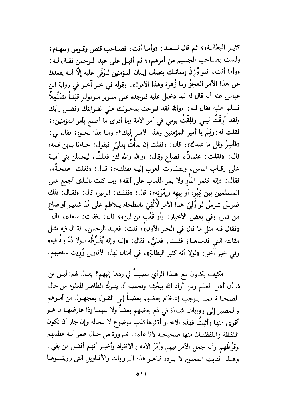 فيكف يكون مَعَ هَذَا الرَّأْي مصيبا فِي ردهَا إِلَيْهِم يُقَال لَهُم لَيْسَ من شَأْن أهل الْعلم وَمن أَرَادَ الله ببحثه وفحصه أَن يتْرك الظَّاهِر الْمَعْلُوم من حَال الصَّحَابَة مِمَّا يُوجب إعظام بَعضهم بَعْضًا إِلَى القَوْل بِمَجْهُول من أَمرهم والمصير إِلَى رِوَايَات شَاذَّة فِي ذمّ بَعضهم بَعْضًا وَلَا سِيمَا إِذا عارضها مَا هُوَ أقوى مِنْهَا وَأثبت فَهَذِهِ الْأَخْبَار أَكْثَرهَا كذب مَوْضُوع لَا محَالة وَإِن جَازَ أَن تكون اللَّفْظَة واللفظتان مِنْهَا صَحِيحَة لأَنا علمنَا ضَرُورَة من حَال عمر أَنه عظمهم وقرظهم وَأَنه جعل الْأَمر فيهم وَأمر الْأمة بالانقياد وَأخْبر أَنهم أفضل من بَقِي