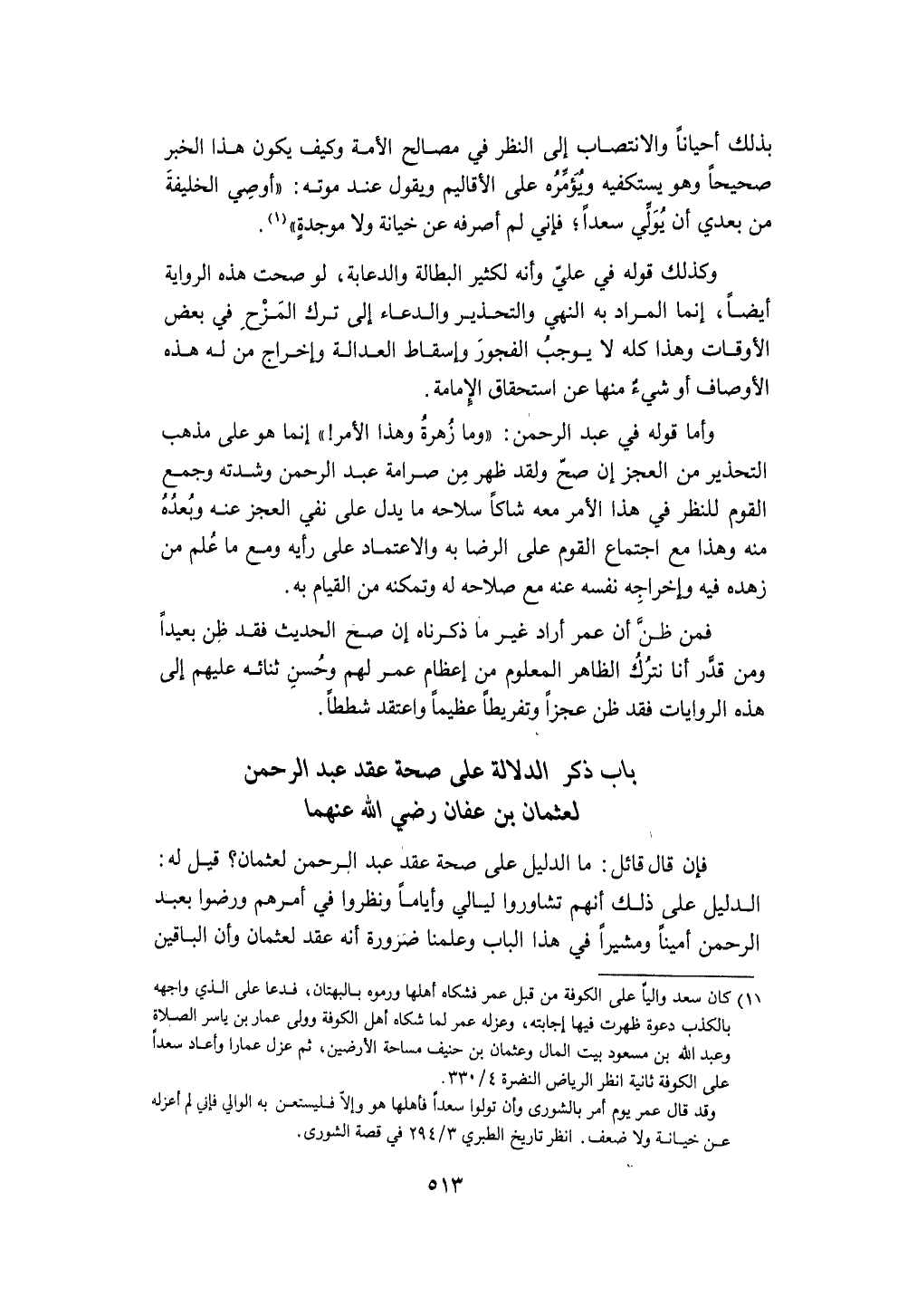 فَإِن قَالَ قَائِل مَا الدَّلِيل على صِحَة عقد عبد الرَّحْمَن لعُثْمَان قيل لَهُ الدَّلِيل على ذَلِك أَنهم تشاوروا ليَالِي وأياما ونظروا فِي أَمرهم وَرَضوا بِعَبْد الرَّحْمَن أَمينا ومشيرا فِي هَذَا الْبَاب وَعلمنَا ضَرُورَة أَنه عقد لعُثْمَان وَأَن البَاقِينَ