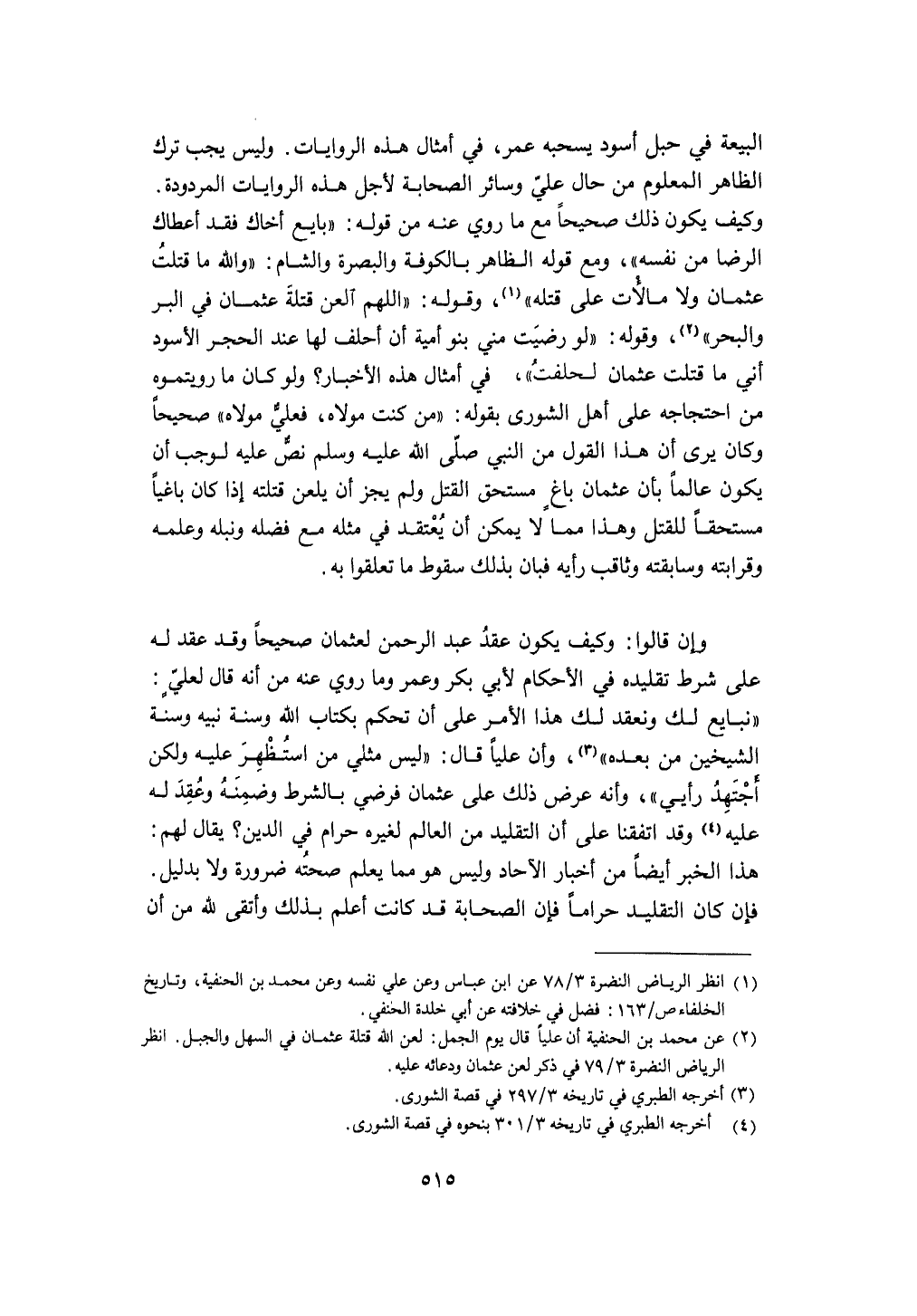 وَإِن قَالُوا وَكَيف يكون عقد عبد الرَّحْمَن لعُثْمَان صَحِيحا وَقد عقد لَهُ على شَرط تَقْلِيده فِي الْأَحْكَام لأبي بكر وَعمر وَمَا رُوِيَ عَنهُ من أَنه قَالَ لعَلي نُبَايِع لَك ونعقد لَك هَذَا الْأَمر على أَن تحكم بِكِتَاب الله وَسنة نبيه وَسنة الشَّيْخَيْنِ من بعده وَأَن عليا قَالَ لَيْسَ مثلي من استظهر عَلَيْهِ وَلَكِن أجتهد رَأْيِي وَأَنه عرض ذَلِك على عُثْمَان فَرضِي بِالشّرطِ وَضَمنَهُ وَعقد لَهُ عَلَيْهِ وَقد اتفقنا على أَن التَّقْلِيد من الْعَالم لغيره حرَام فِي الدّين يُقَال لَهُم هَذَا الْخَبَر أَيْضا من أَخْبَار الْآحَاد وَلَيْسَ هُوَ مِمَّا يعلم صِحَّته ضَرُورَة وَلَا بِدَلِيل