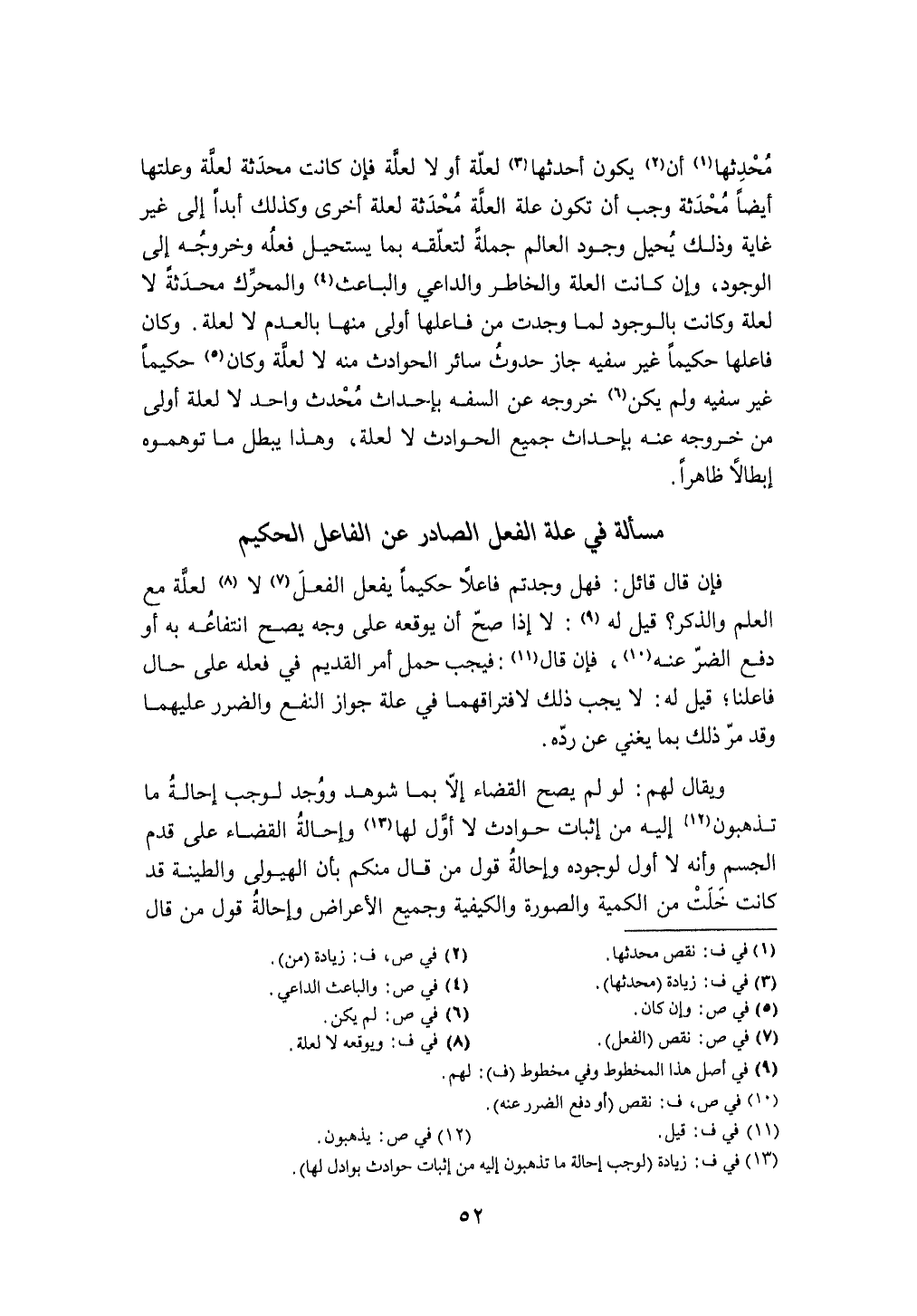 محدثها أَن يكون أحدثها لعِلَّة أَو لَا لعِلَّة فَإِن كَانَت محدثة لعِلَّة وعلتها أَيْضا محدثة وَجب أَن تكون عِلّة الْعلَّة محدثة لعِلَّة أُخْرَى وَكَذَلِكَ أبدا إِلَى غير غَايَة وَذَلِكَ يحِيل وجود الْعَالم جملَة لتَعَلُّقه بِمَا يَسْتَحِيل فعله وَخُرُوجه إِلَى الْوُجُود وَإِن كَانَت الْعلَّة والخاطر والداعي والباعث والمحرك محدثة لَا لعِلَّة وَكَانَت بالوجود لما وجدت من فاعلها أولى مِنْهَا بِالْعدمِ لَا لعِلَّة