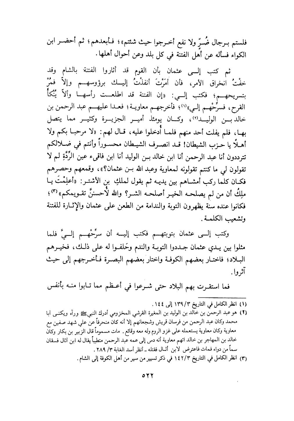 ثمَّ كتب إِلَى عُثْمَان بِأَن الْقَوْم قد أثاروا الْفِتْنَة بِالشَّام وَقد خفت انخراق الْأَمر فَأن أمرت أنفذت إِلَيْك برؤوسهم وَإِلَّا فَمر بتسريحهم فَكتب إِلَيّ إِن الْفِتْنَة قطّ اطَّلَعت رَأسهَا وَألا ينْكَأ الْقرح فسرحهم إِلَيّ فَأخْرجهُمْ مُعَاوِيَة فَعدا عَلَيْهِم عبد الرَّحْمَن بن خَالِد بن الْوَلِيد وَكَانَ يَوْمئِذٍ أَمِير الجزيرة وَكثير مِمَّا يتَّصل بهَا فَلم يفلت أحد مِنْهُم فَلَمَّا أدخلُوا عَلَيْهِ قَالَ لَهُم لَا مرْحَبًا بكم وَلَا أَهلا يَا حزب الشَّيْطَان قد انْصَرف الشَّيْطَان محسورا وَأَنْتُم فِي ضلالكم تترددون أَنا عبد الرَّحْمَن أَنا ابْن خَالِد بن الْوَلِيد أَنا ابْن فاقىء عين الرِّدَّة لم لَا تَقولُونَ لي مَا كُنْتُم تقولونه لمعاوية وَعبد الله بن عُثْمَان وقمعهم وحصرهم فَكَانَ كلما ركب أَمْشَاهُم بَين يَدَيْهِ ثمَّ يَقُول لملك بن الأشتر أعلمت يَا ملك أَن من لم يصلحه الْخَيْر أصلحه الشَّرّ وَالله لأحسنن تقويمكم فَكَانُوا عِنْده سنة يظهرون التَّوْبَة والندامة من الطعْن على عُثْمَان والإثارة للفتنة وتشعيب الْكَلِمَة