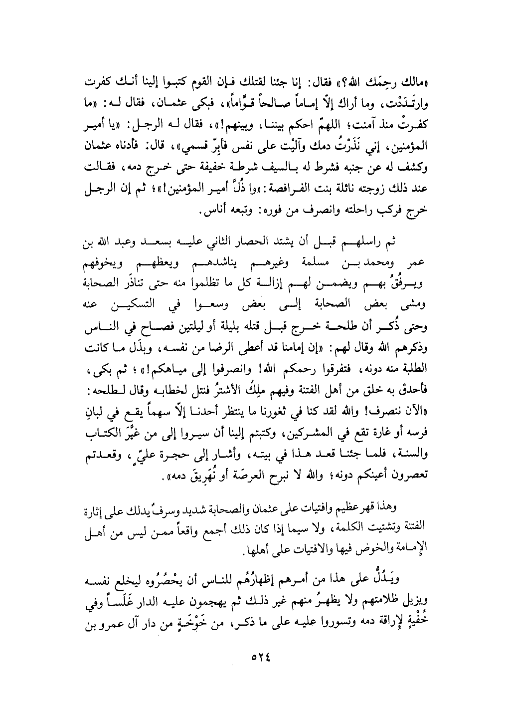 مَالك رَحِمك الله فَقَالَ إِنَّا جِئْنَا لقتلك فَإِن الْقَوْم كتبُوا إِلَيْنَا أَنَّك كفرت وارتددت وَمَا أَرَاك إِلَّا إِمَامًا صَالحا قواما فَبكى عُثْمَان فَقَالَ لَهُ مَا كفرت مُنْذُ آمَنت اللَّهُمَّ احكم بَيْننَا وَبينهمْ فَقَالَ لَهُ الرجل يَا أَمِير الْمُؤمنِينَ إِنِّي نذرت دمك وآليت على نفس فأبر قسمي قَالَ فأدناه عُثْمَان وكشف لَهُ عَن جنبه فَشرط لَهُ بِالسَّيْفِ شرطة خَفِيفَة حَتَّى خرج دَمه فَقَالَت عِنْد ذَلِك زَوجته نائلة بنت الفرافصة واذل أَمِير الْمُؤمنِينَ ثمَّ إِن الرجل خرج فَركب رَاحِلَته وَانْصَرف من فوره وَتَبعهُ أنَاس
