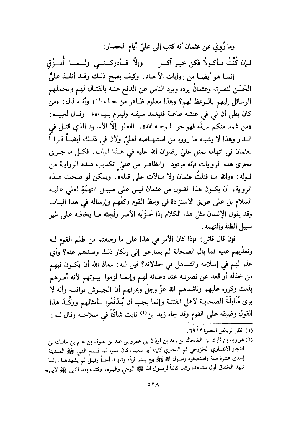 وَكَيف يَصح ذَلِك وَقد أنفذ عَليّ الْحسن لنصرته وَعُثْمَان يردهُ وَيرد النَّاس عَن الدّفع عَنهُ بِالْقِتَالِ لَهُم ويحملهم الرسائل إِلَيْهِم بالوعظ لَهُم وَهَذَا مَعْلُوم ظَاهر من حَاله وَأَنه قَالَ من كَانَ يظنّ أَن لي فِي عُنُقه طَاعَة فليغمد سَيْفه وليلزم بَيته وَقَالَ لعبيده من غمد مِنْكُم سَيْفه فَهُوَ حر لوجه الله فَفَعَلُوا إِلَّا الْأسود الَّذِي قتل فِي الدَّار وَهَذَا لَا يشبه مَا رَوَوْهُ من استنهاضه لعَلي وَلِأَن فِي ذَلِك أَيْضا قرفا لعُثْمَان فِي اتهامه لمثل عَليّ رضوَان الله عَلَيْهِ فِي هَذَا الْبَاب