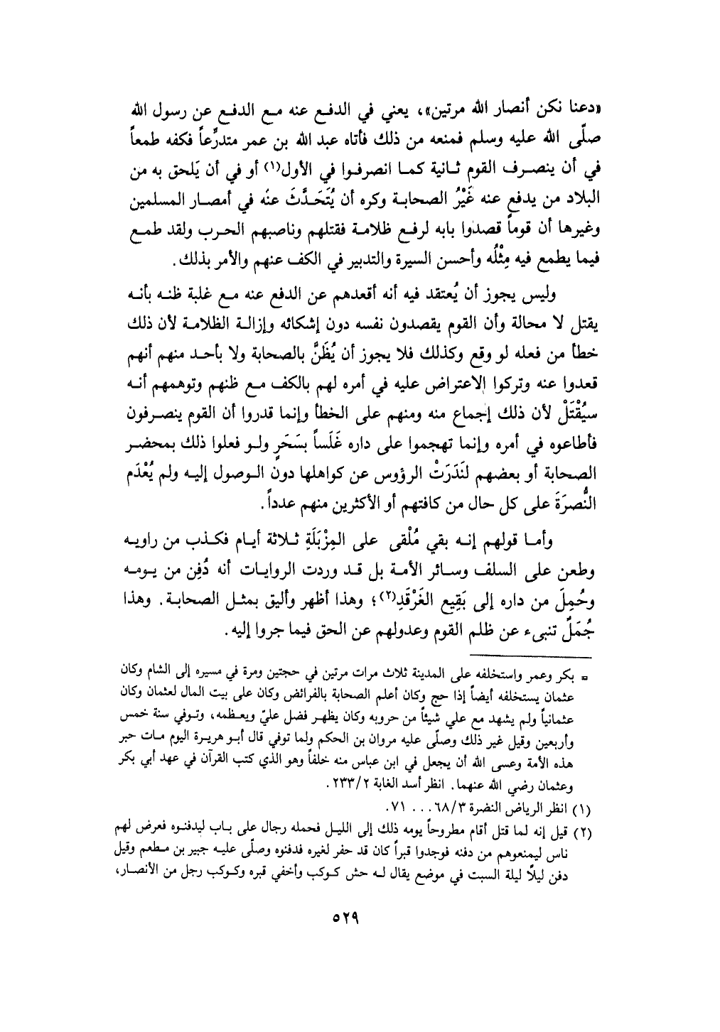 وَلَيْسَ يجوز أَن يعْتَقد فِيهِ أَنه أقعدهم عَن الدّفع عَنهُ مَعَ غَلَبَة ظَنّه بِأَنَّهُ يقتل لَا محَالة وَأَن الْقَوْم يقصدون نَفسه دون إشكائه وَإِزَالَة الظلامة لِأَن ذَلِك خطأ من فعله لَو وَقع وَكَذَلِكَ فَلَا يجوز أَن يظنّ بالصحابة وَلَا بِأحد مِنْهُم أَنهم قعدوا عَنهُ وَتركُوا الِاعْتِرَاض عَلَيْهِ فِي أمره لَهُم بالكف مَعَ ظنهم وتوهمهم أَنه سيقتل لِأَن ذَلِك إِجْمَاع مِنْهُ وَمِنْهُم على الْخَطَأ وَإِنَّمَا قدرُوا أَن الْقَوْم يَنْصَرِفُونَ فأطاعوه فِي أمره وَإِنَّمَا تهجموا على دَاره غلسا بِسحر وَلَو فعلوا ذَلِك بِمحضر الصَّحَابَة أَو بَعضهم لندرت الرؤوس عَن كواهلها دون الْوُصُول إِلَيْهِ وَلم يعْدم النُّصْرَة على كل حَال من كافتهم أَو الْأَكْثَرين مِنْهُم عددا