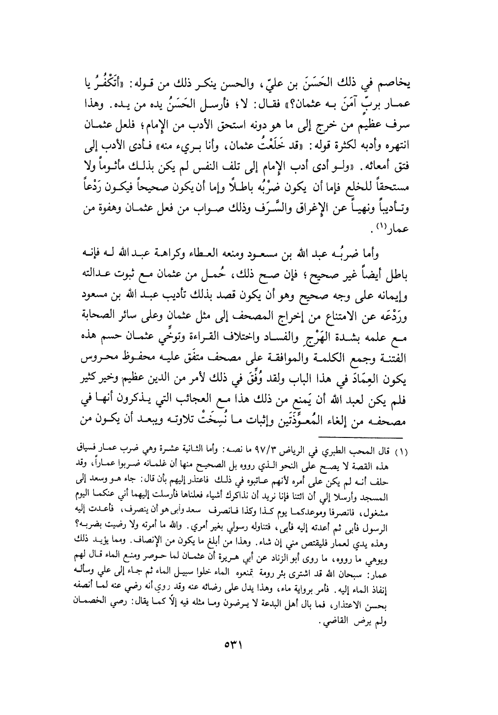 وَأما ضربه عبد الله بن مَسْعُود وَمنعه الْعَطاء وَكَرَاهَة عبد الله لَهُ فَإِنَّهُ بَاطِل أَيْضا غير صَحِيح فَإِن صَحَّ ذَلِك حمل من عُثْمَان مَعَ ثُبُوت عَدَالَته وإيمانه على وَجه صَحِيح وَهُوَ أَن يكون قصد بذلك تَأْدِيب عبد الله بن مَسْعُود وردعه عَن الِامْتِنَاع من إِخْرَاج الْمُصحف إِلَى مثل عُثْمَان وعَلى سَائِر الصَّحَابَة مَعَ علمه بِشدَّة الْهَرج وَالْفساد وَاخْتِلَاف الْقِرَاءَة وتوخي عُثْمَان حسم هَذِه الْفِتْنَة وَجمع الْكَلِمَة والموافقة على مصحف مُتَّفق عَلَيْهِ مَحْفُوظ محروس يكون الْعِمَاد فِي هَذَا الْبَاب وَلَقَد وفْق فِي ذَلِك لأمر من الدّين عَظِيم وَخير كثير فَلم يكن لعبد الله أَن يمْنَع من ذَلِك هَذَا مَعَ الْعَجَائِب الَّتِي يذكرُونَ أَنَّهَا فِي مصحفه من إِلْغَاء المعوذتين وَإِثْبَات مَا نسخت تِلَاوَته وَيبعد أَن يكون من