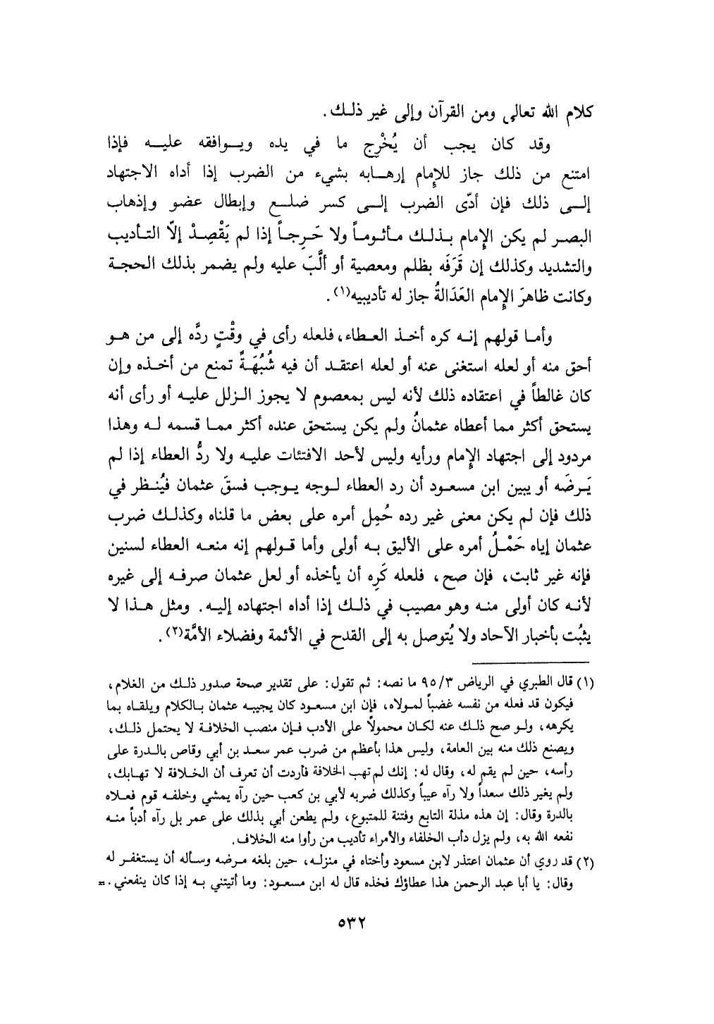 وَأما قَوْلهم إِنَّه كره أَخذ الْعَطاء فَلَعَلَّهُ رأى فِي وَقت رده إِلَى من هُوَ أَحَق مِنْهُ أَو لَعَلَّه اسْتغنى عَنهُ أَو لَعَلَّه اعْتقد أَن فِيهِ شُبْهَة تمنع من أَخذه وَإِن كَانَ غالطا فِي اعْتِقَاده ذَلِك لِأَنَّهُ لَيْسَ بمعصوم لَا يجوز الزلل عَلَيْهِ أَو رأى أَنه يسْتَحق أَكثر مِمَّا أعطَاهُ عُثْمَان وَلم يكن يسْتَحق عِنْده أَكثر مِمَّا قسمه لَهُ وَهَذَا مَرْدُود إِلَى اجْتِهَاد الإِمَام ورأيه وَلَيْسَ لأحد الافتئات عَلَيْهِ وَلَا رد الْعَطاء إِذا لم يرضه أَو يبين ابْن مَسْعُود أَن رد الْعَطاء لوجه يُوجب فسق عُثْمَان فَينْظر فِي ذَلِك فَإِن لم يكن معنى غير رده حمل أمره على بعض مَا قُلْنَاهُ وَكَذَلِكَ ضرب عُثْمَان إِيَّاه حمل أمره على الْأَلْيَق بِهِ أولى وَأما قَوْلهم إِنَّه مَنعه الْعَطاء لسنين فَإِنَّهُ غير ثَابت فَإِن صَحَّ فَلَعَلَّهُ كره أَن يَأْخُذهُ أَو لَعَلَّ عُثْمَان صرفه إِلَى غَيره لِأَنَّهُ كَانَ أولى مِنْهُ وَهُوَ مُصِيب فِي ذَلِك إِذا أَدَّاهُ اجْتِهَاده إِلَيْهِ